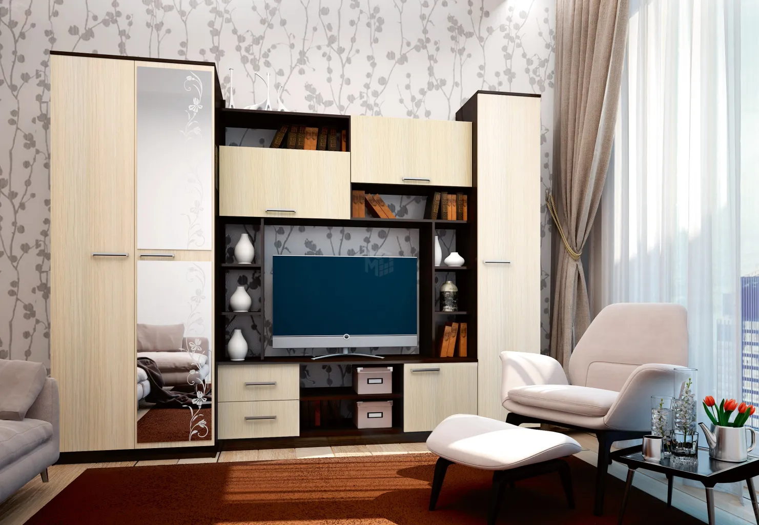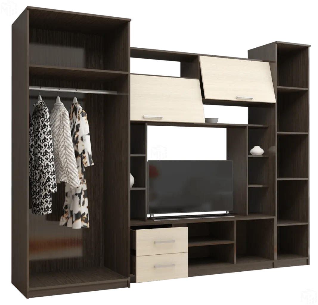 Гостиная собирается в левом и правом исполнении. Шкафы можно ставить отдельно -