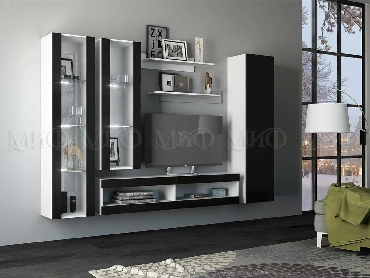 Корпус гостиной выполнен из ЛДСП, фасады МДФ Черный глянец.