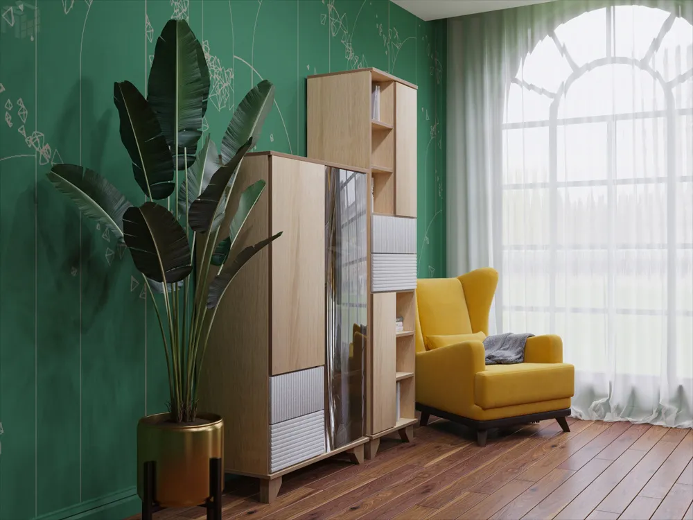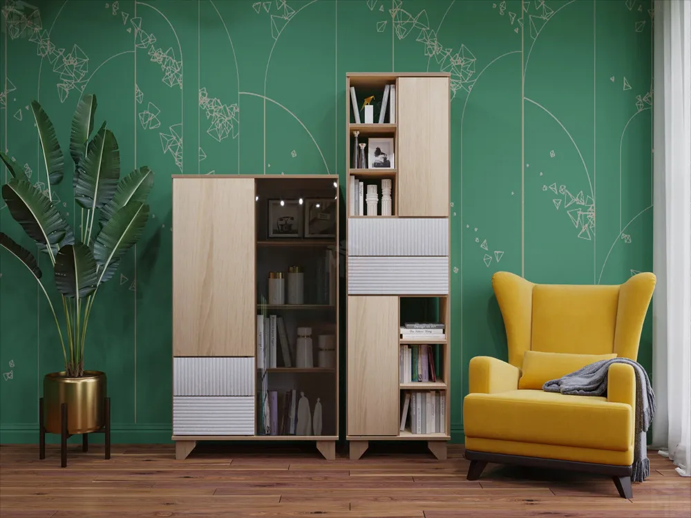 Применение композиционных принципов при обустройстве помещений позволяет гармонично расположить мебель и сохранить дизайнерское решение. Стеллаж со стеклом и пенал серии мебели в скандинавском стиле дают возможность разместить как предметы декора, любимые книги и фото, так и личные вещи.