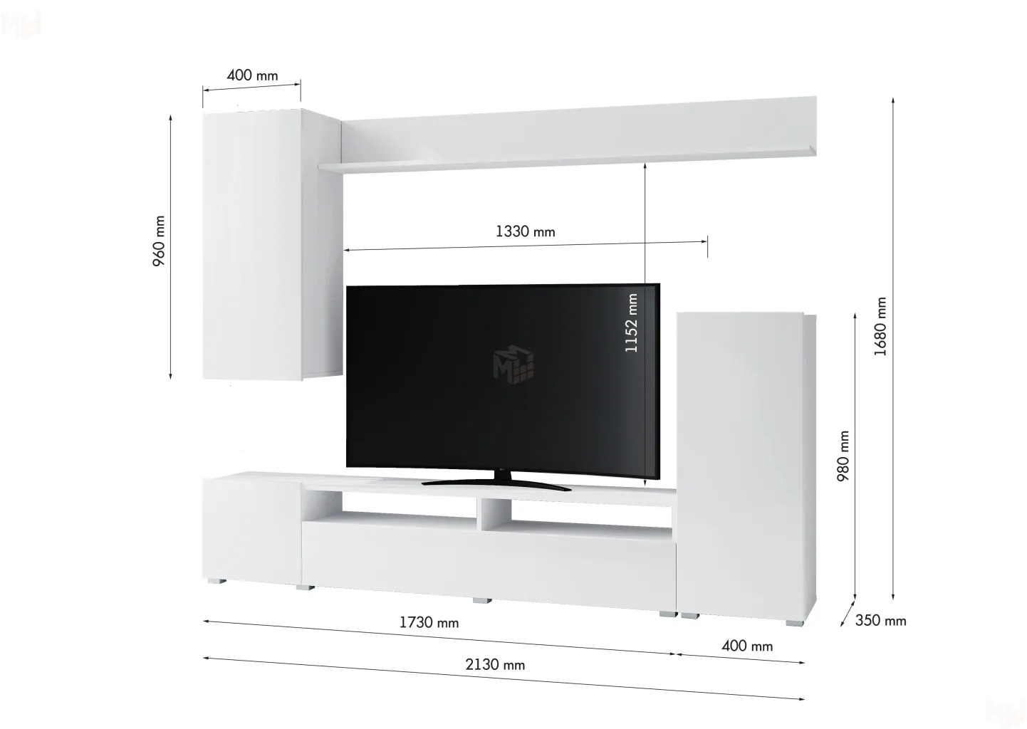 Корпус и фасады гостиной выполнены из ЛДСП белого цвета 16 мм.