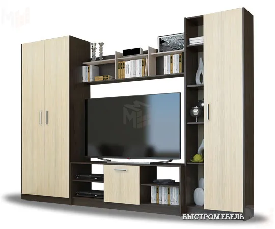 В центре расположена большая ниша под телевизор, имеющая внизу необходимые полки под устройства, подключаемые к нему. Наверх в полки можно поставить красивые декоративные элементы или книги, дополняющие общий стиль комнаты.