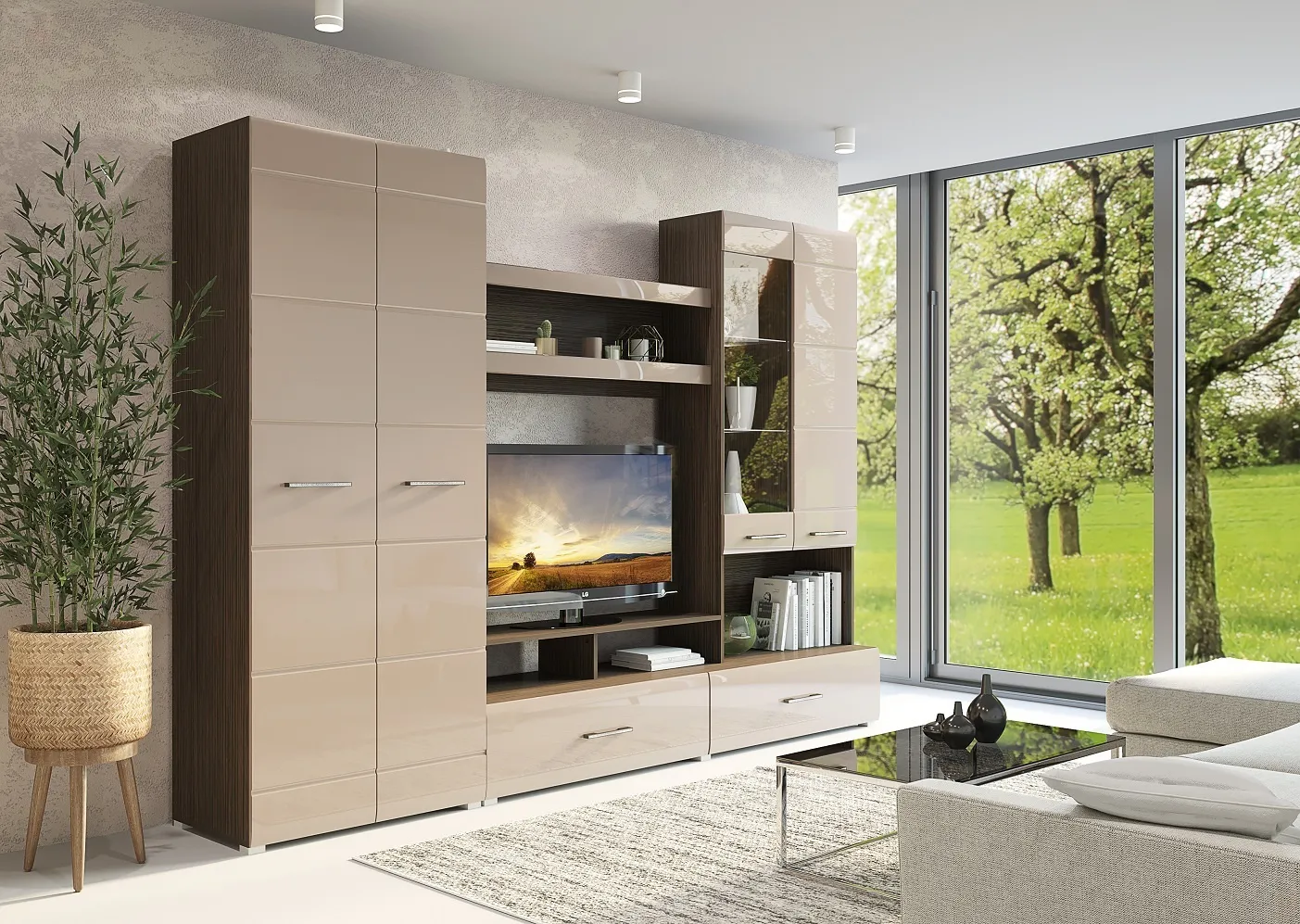 Композиция гарнитура для гостиной Ненси-1 имеет асимметричное решение, которое позволяет оставить достаточно воздуха для того, чтобы не создавалось впечатление нагромождения вещей.Цвет: Венге/какао глянец
