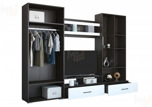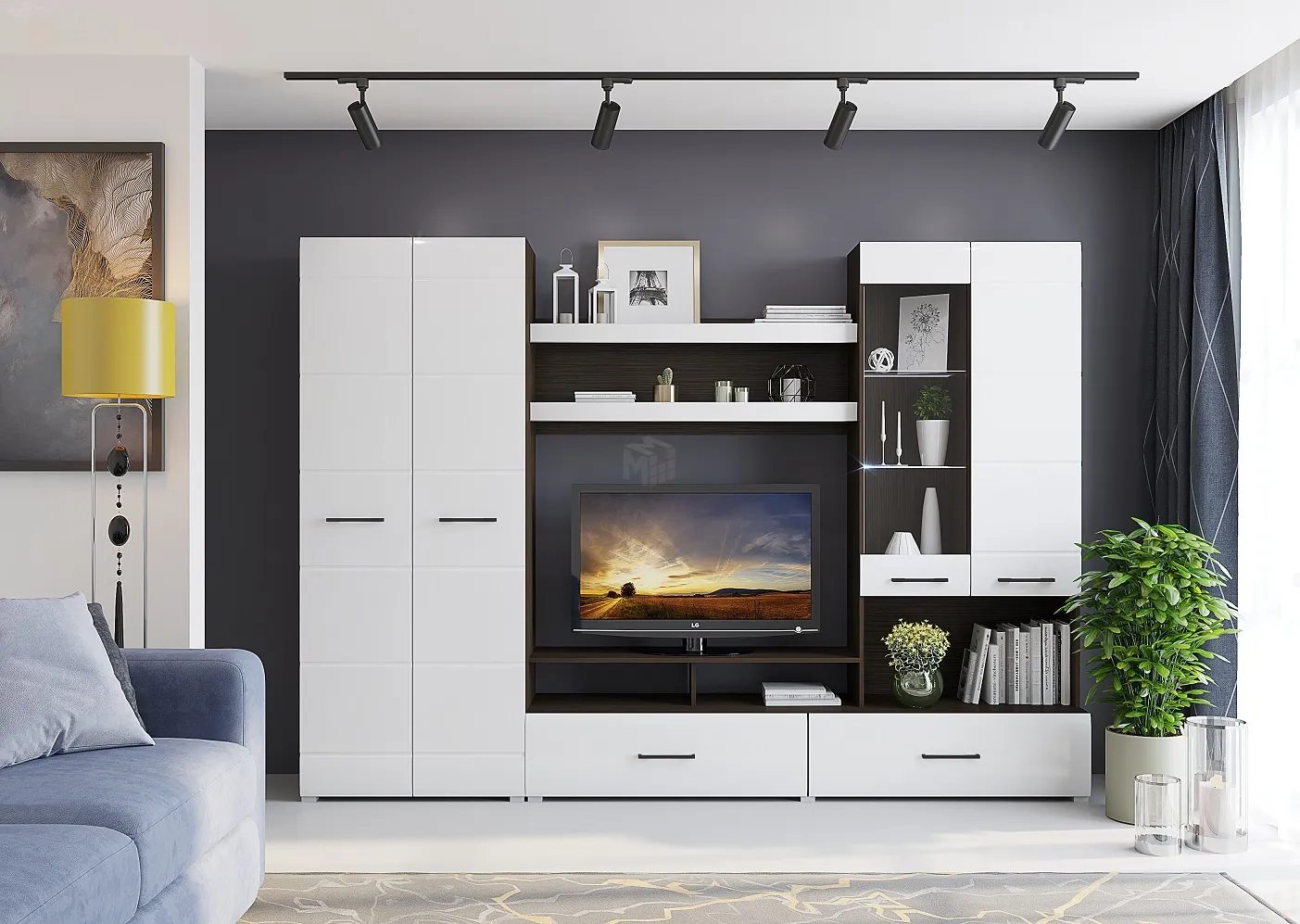 Композиция гарнитура для гостиной Ненси-1 имеет асимметричное решение, которое позволяет оставить достаточно воздуха для того, чтобы не создавалось впечатление нагромождения вещей.Белая глянцевая фактура фасадов в сочетании с тёмным венге – классическая комбинация и беспроигрышный вариант для оформления современной гостиной. Эта цветовая гамма подходит как для тех, кто не любит изысков в интерьере, так и для тех, кто желает добавить в оформление интерьера главной комнаты ярких акцентов – белый и венге отлично комбинируются с теплыми оттенками красного, коричневого, холодными синими и серыми.