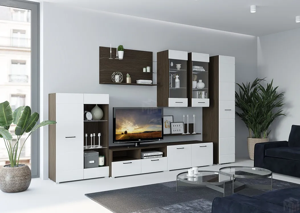 Корпус гостиной выполнен из ЛДСП венге, фасады МДФ белый глянец.
