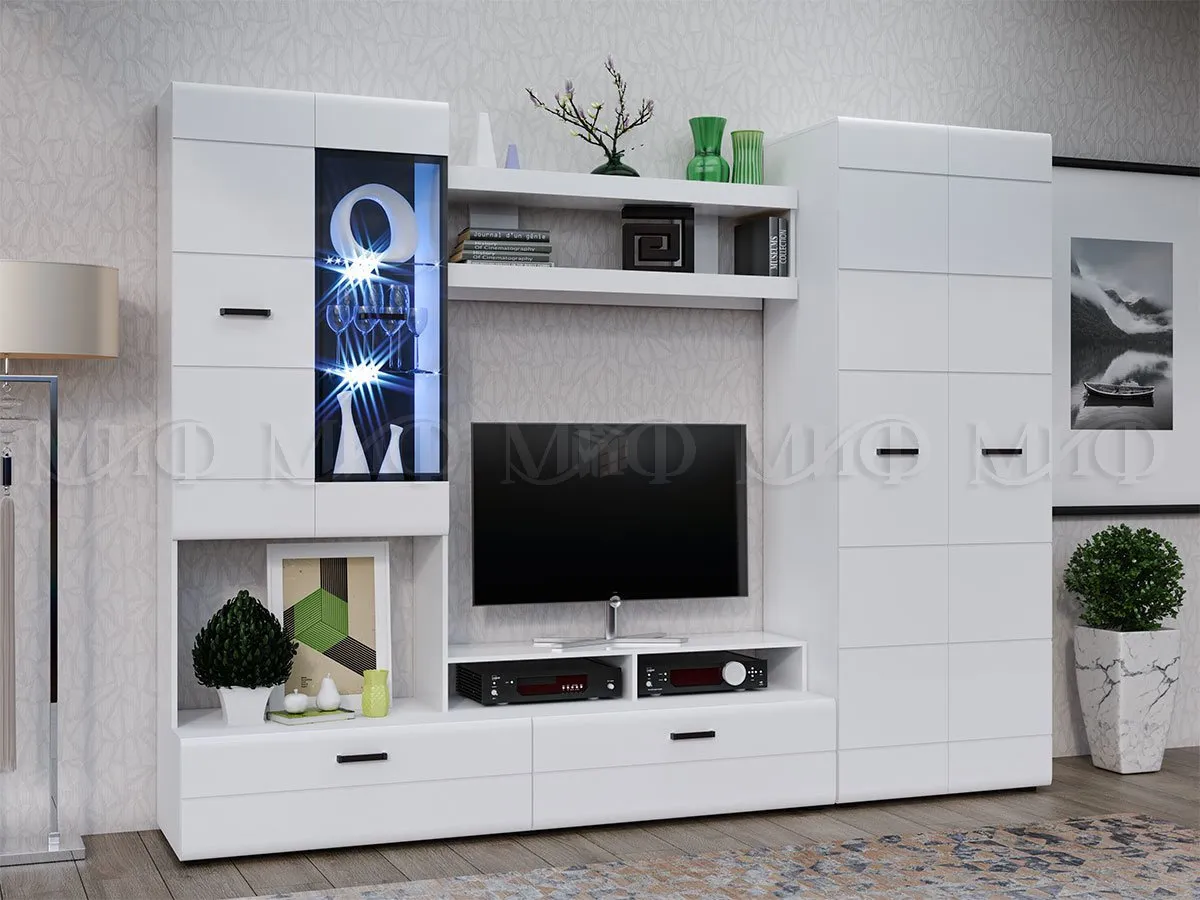 Модульная гостиная Ненси New выполнена в белом цвете: каркас ЛДСП, фасады МДФ белый глянец.