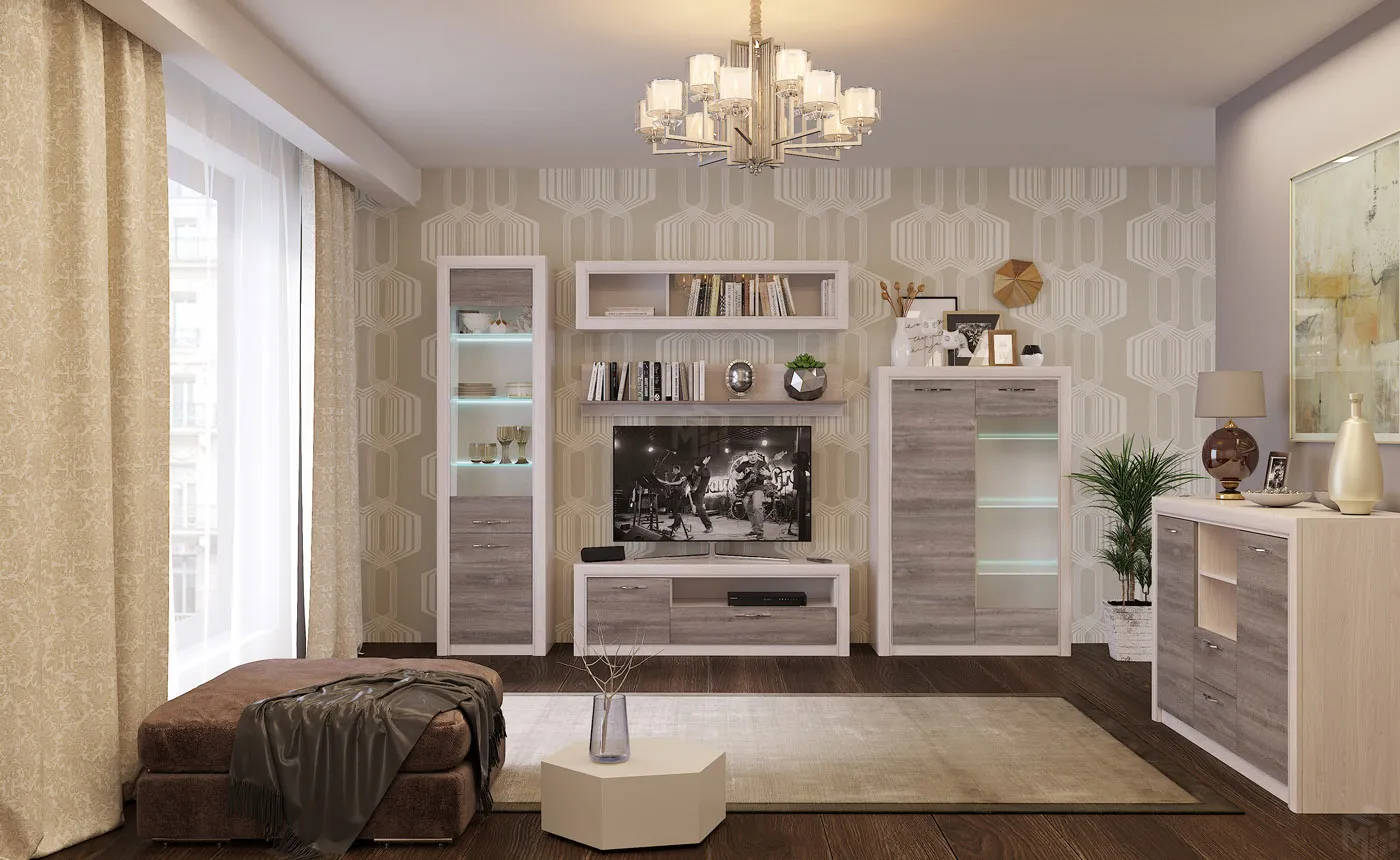 На фото представлена гостиная «ОКТАВА» в следующем цветовом решении: