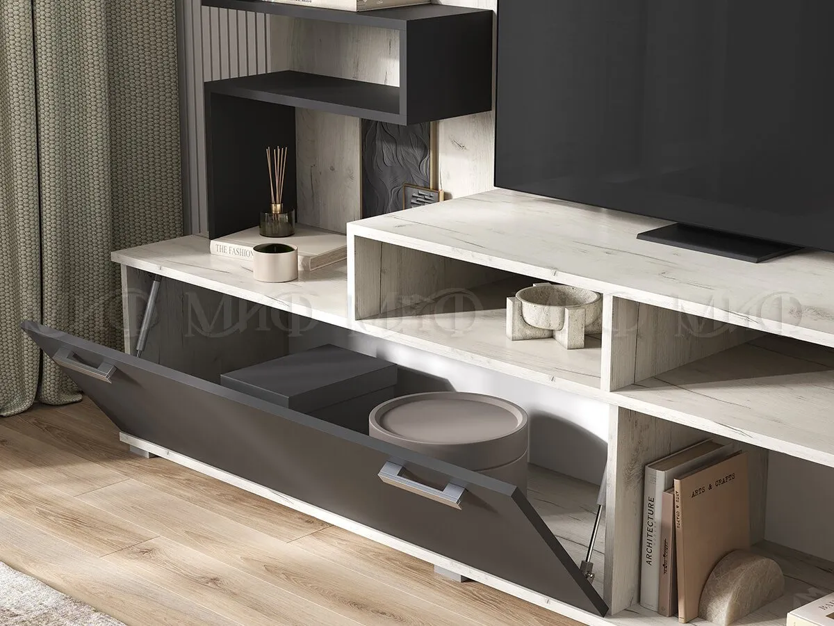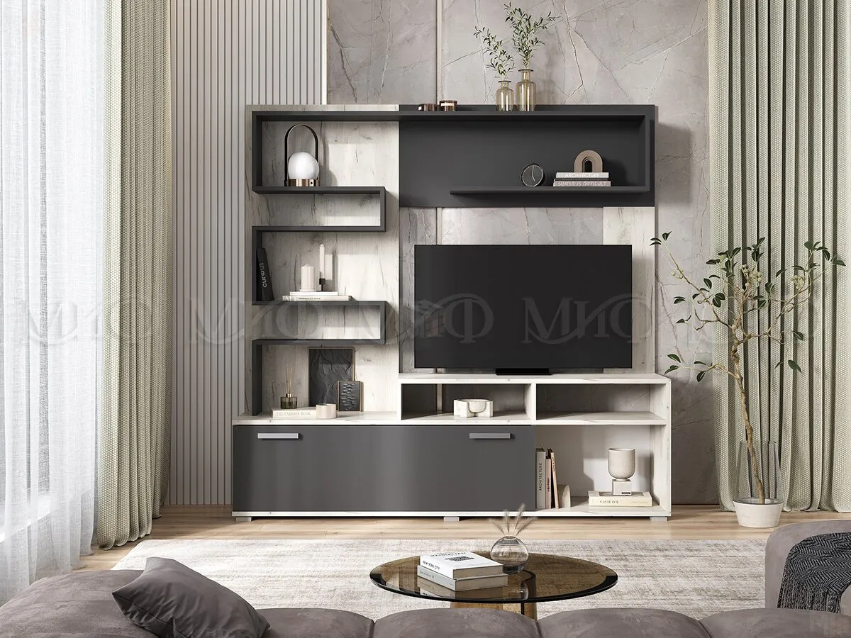 Гостиная Рица воплощает в себе элегантность и функциональность. Красивая и асимметричная, она выглядит весьма эффектно. Основное предназначение – установка видео-аудио техники. Для современной гостиной.