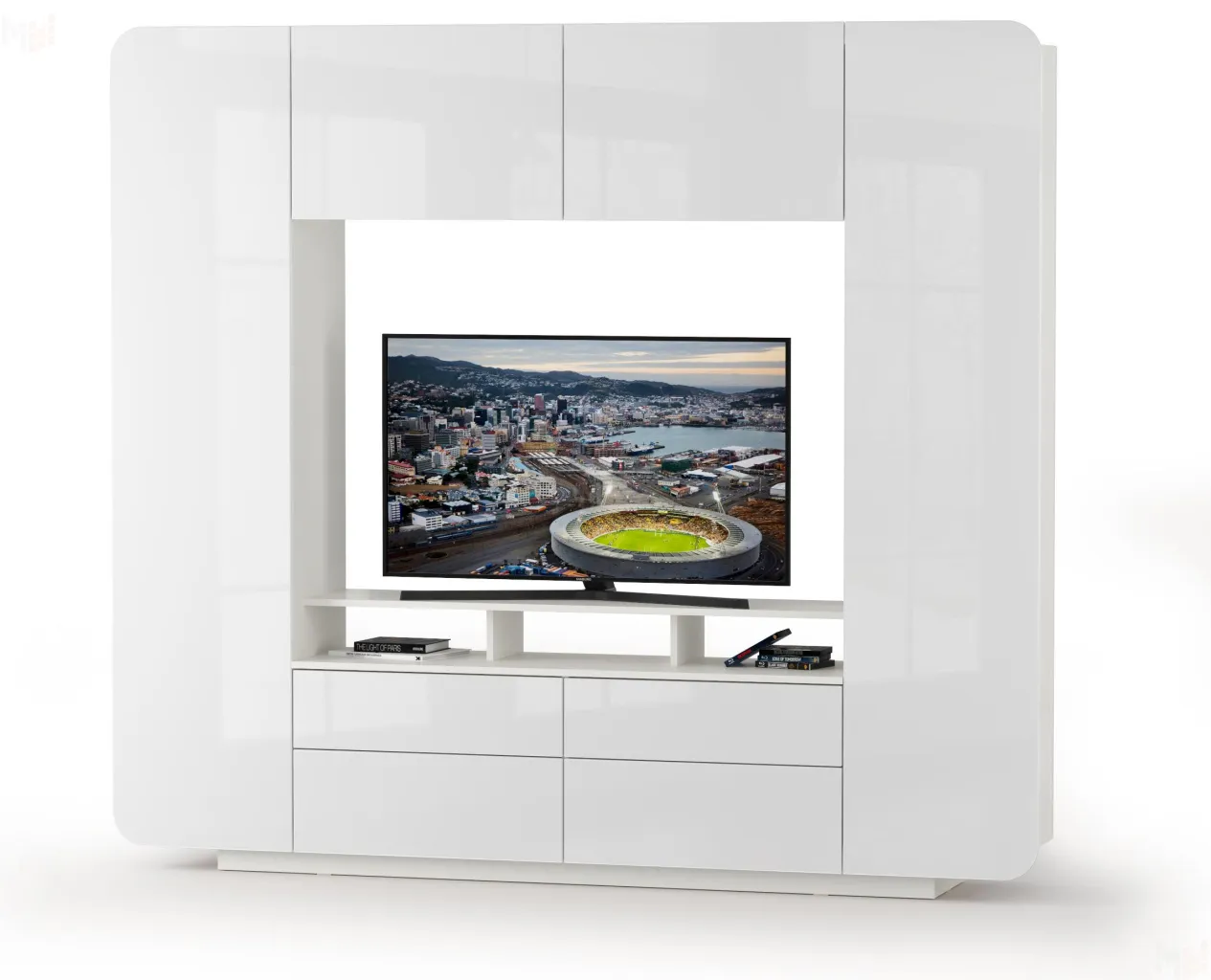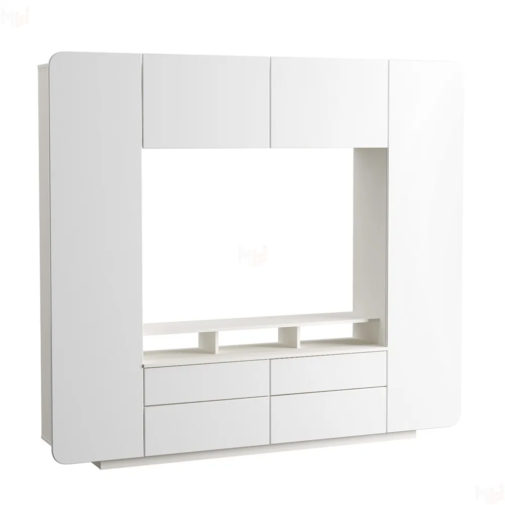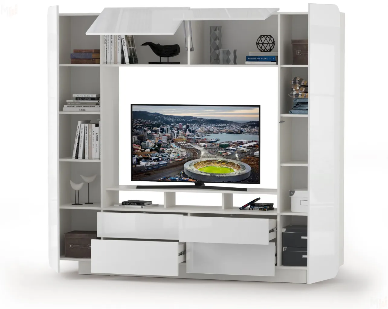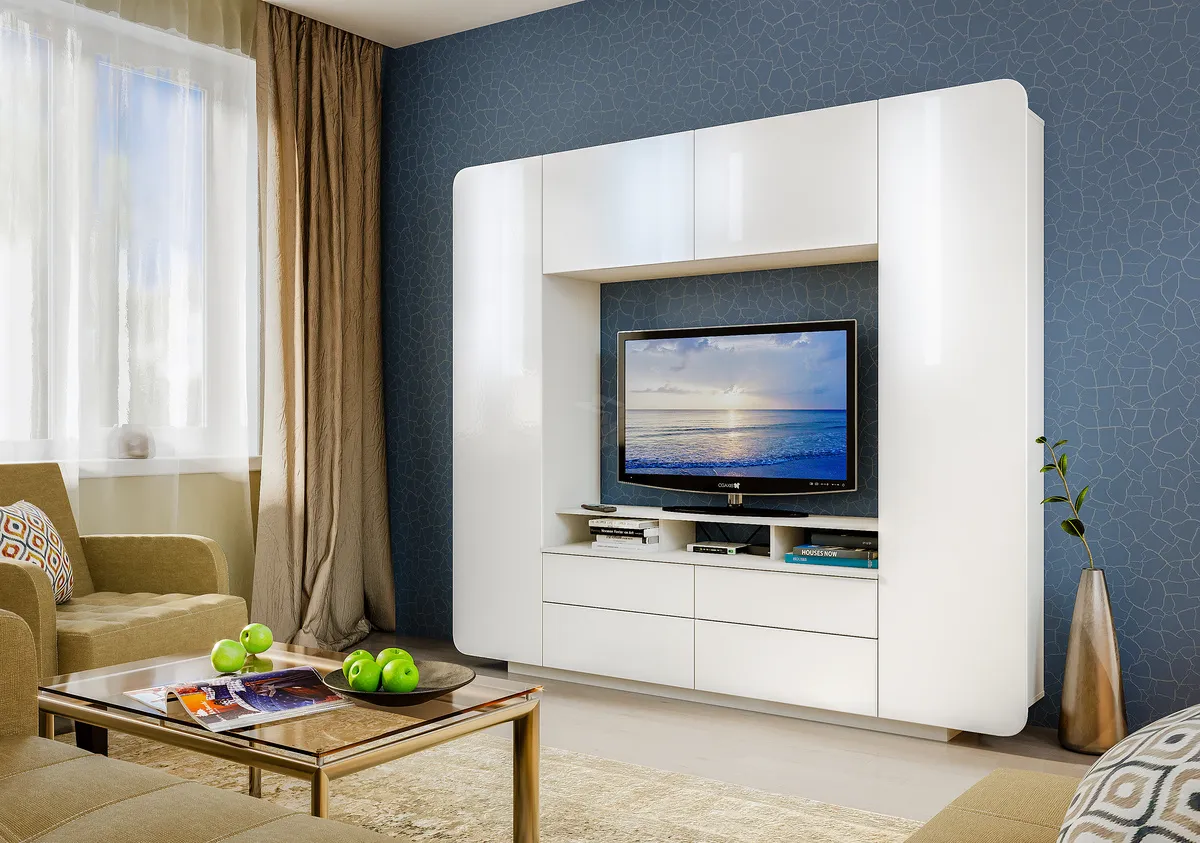 Гостиная Румба отличается оригинальным современным дизайном. Каркас выполнен из ЛДСП белое дерево, фасады МДФ белый глянец.
