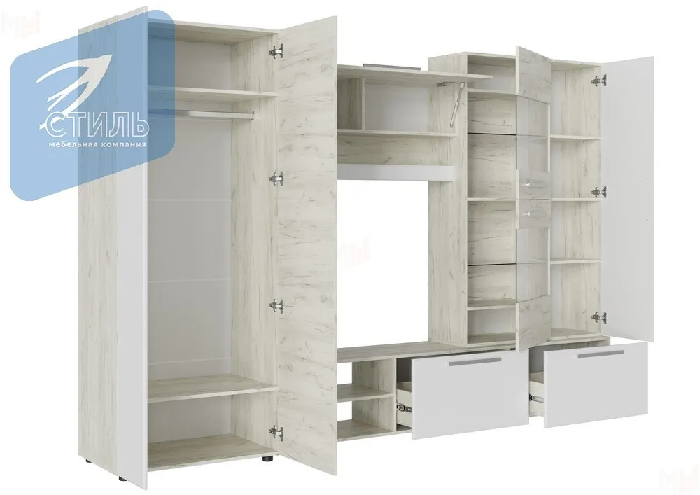 Габаритные размеры всего изделия – Д.3000 х В.2000 х Г.510 мм. Стенка имеет возможность собираться как на левую, так и на правую сторону. Состоит из 4-х модулей (реализуется комплектно - отдельными модулями не поставляется):