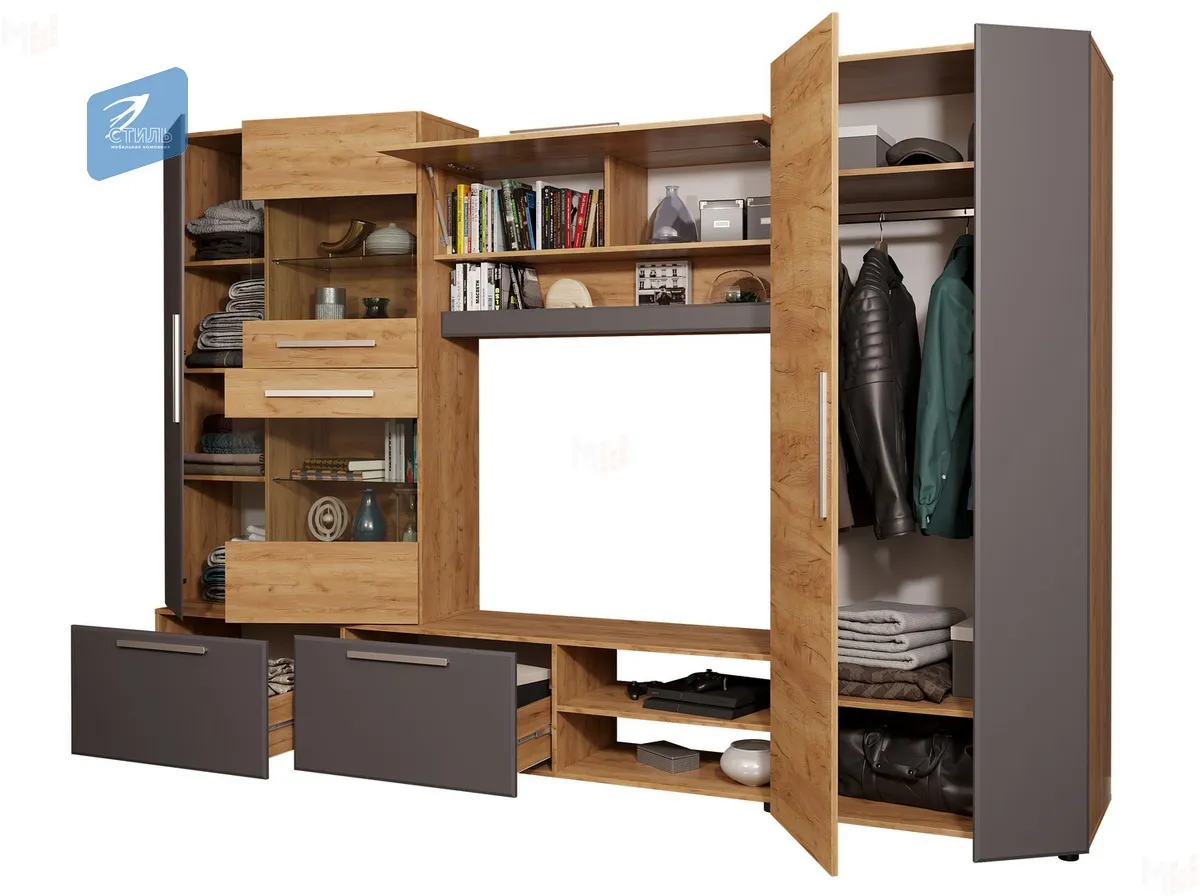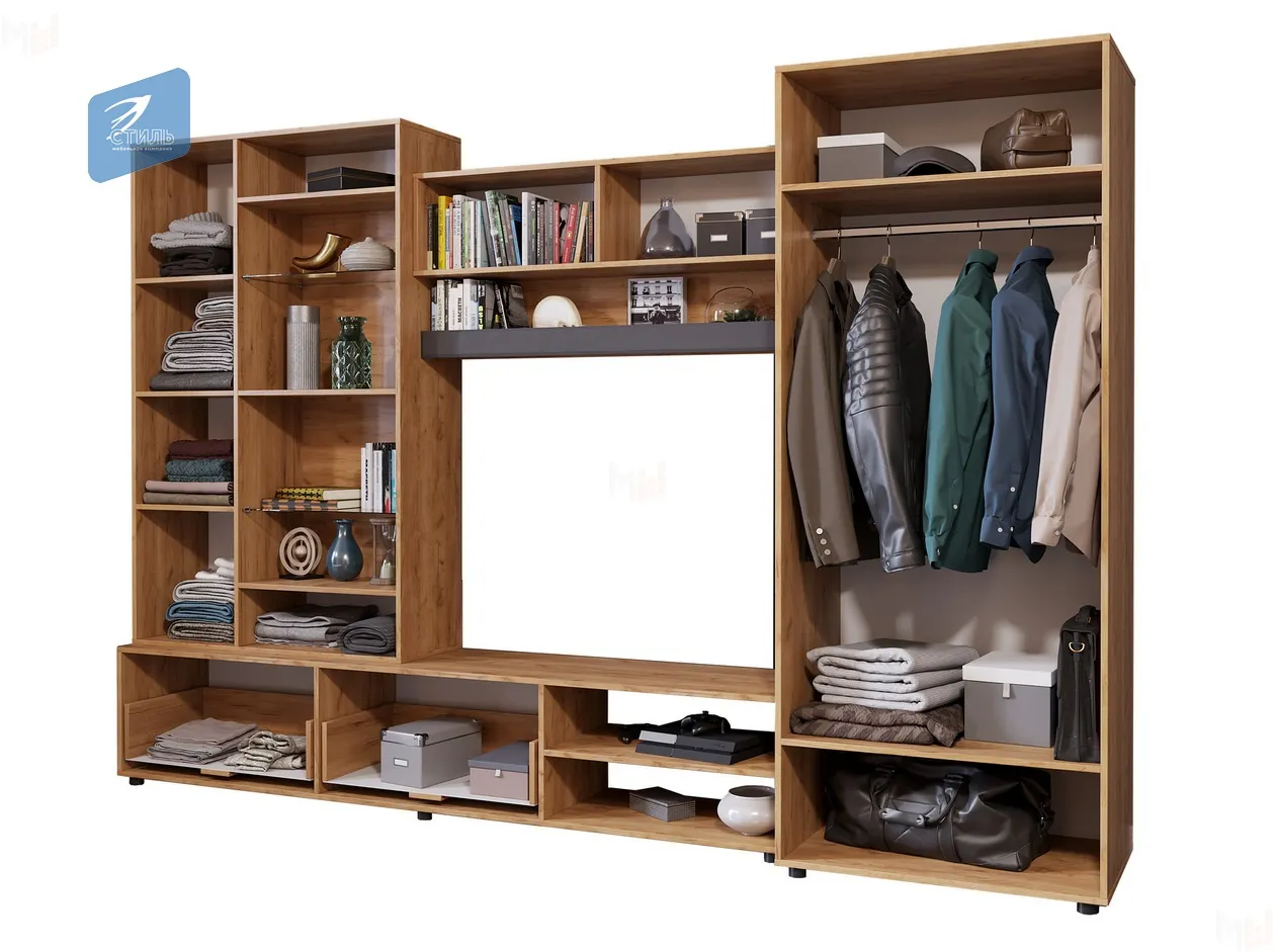 Габаритные размеры всего изделия – Д.3000 х В.2000 х Г.510 мм. Стенка имеет возможность собираться как на левую, так и на правую сторону. Состоит из 4-х модулей (реализуется комплектно - отдельными модулями не поставляется):