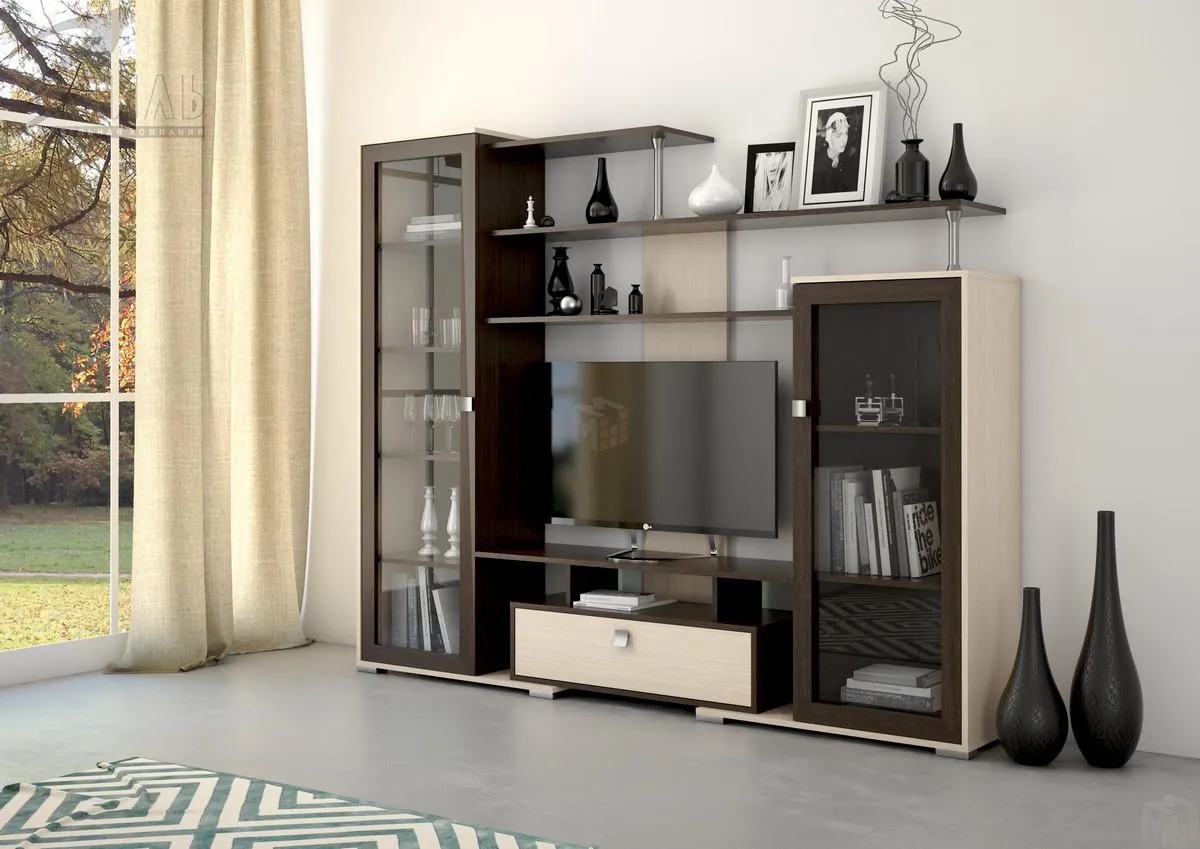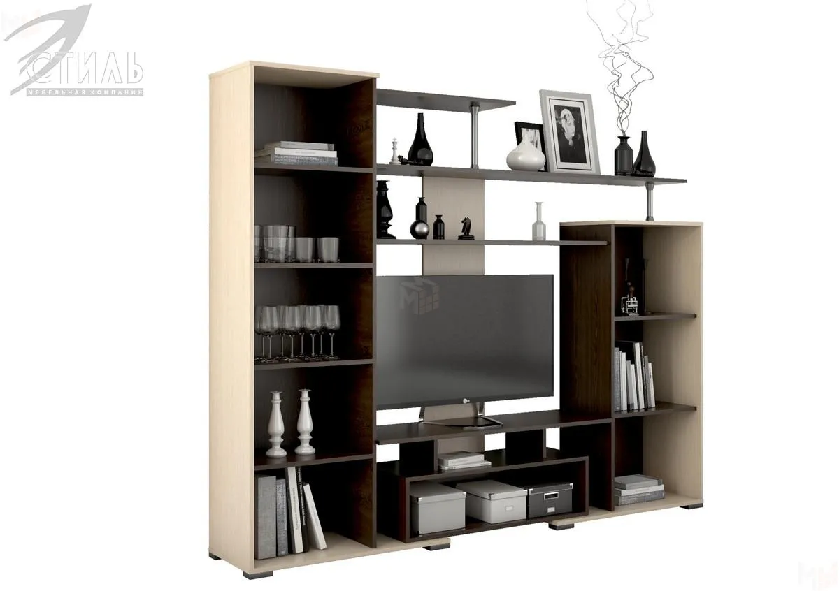 - Гостиная состоит из двух пеналов с полками для книг и посуды, тумбы под ТВ и открытых полок. - Место для ТВ Д1100 х В700 мм. Цвет: венге/дуб молочный. -