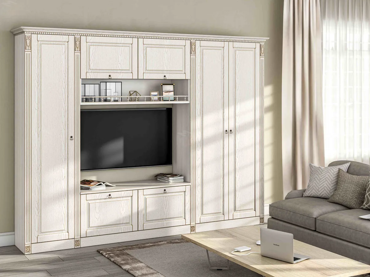 Белоснежная гостиная Вероника, с элегантной патиной, в совершенном классическом стиле, не громоздкая, но вместительная.