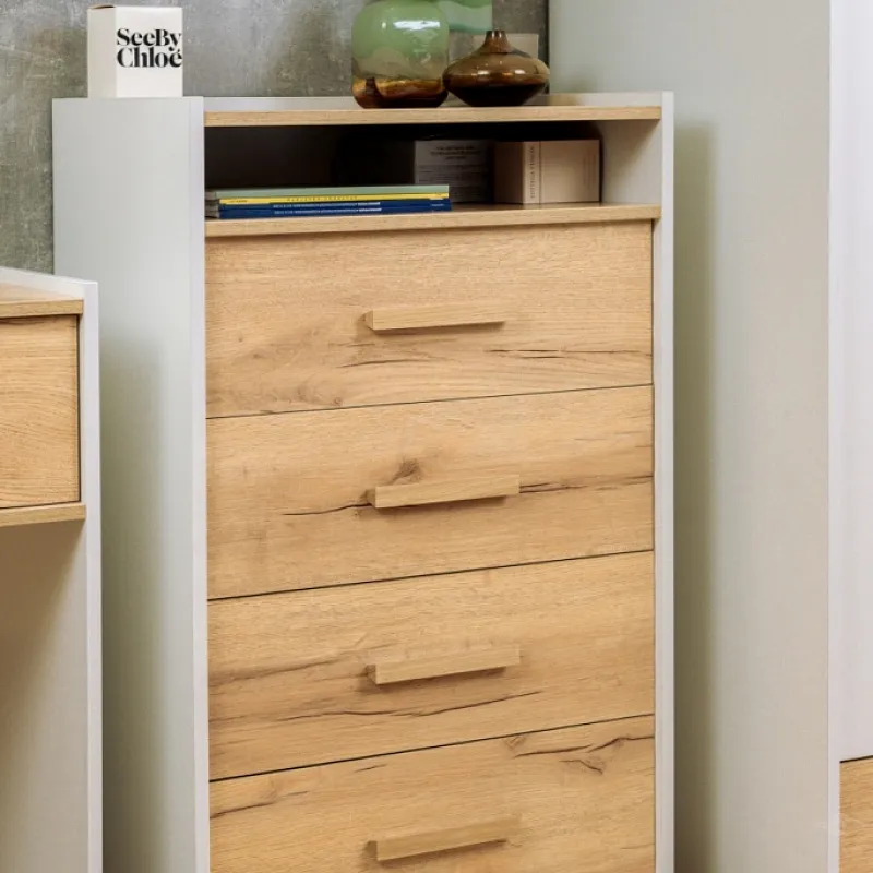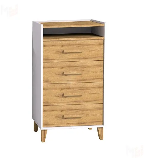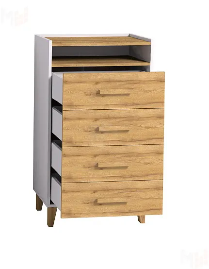 Рационально использовать пространство комнаты поможет высокий Айрис 45 Комод с нишей и 4 вместительными ящиками на шариковых направляющих. Ящики выдерживают нагрузку до 10 кг каждый.