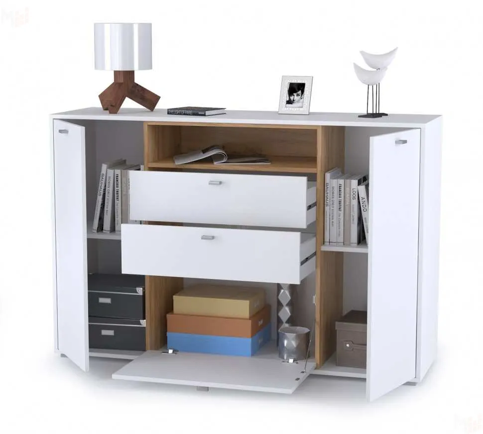 Комод Бэль 10.95 будет отличным дополнением интерьера любой комнаты. Изделие можно использовать в качестве подставки под телевизор или разместить сверху интересные и увлекательные книги, семейные фотографии, коллекции интересных предметов, оригинальные сувениры, статуэтки и детские поделки. Два выдвижных ящика и отделения, скрытые за дверцами, пригодятся для хранения всех необходимых предметов.