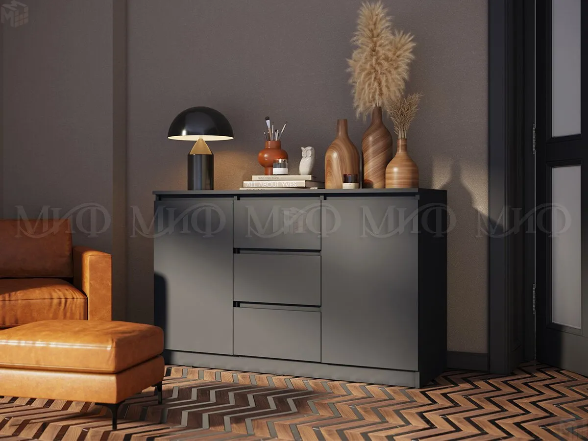 Комод разделен на три секции перегородкой, в средней секции три выдвижных ящика на шариковых направляющих полного выдвижения.