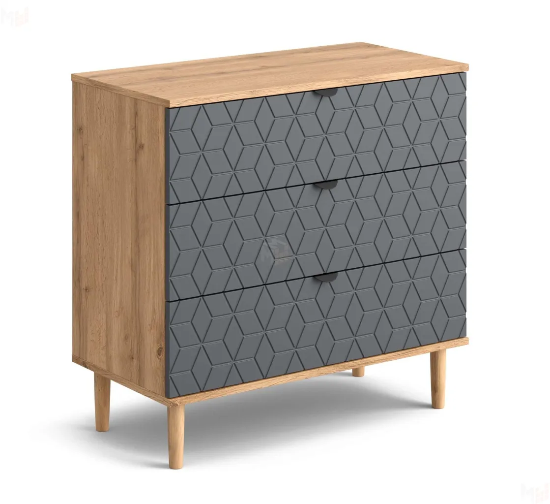 Комод имеет три вместительных выдвижных ящика на шариковых направляющих, в которых удобно хранить белье, одежду, аксессуары.