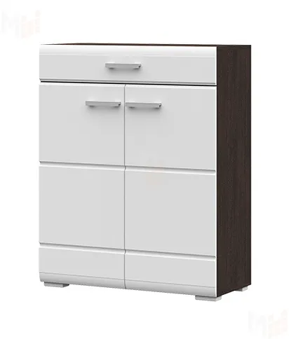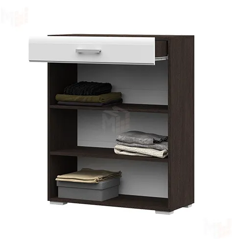 Комод оснащён тремя закрытыми полками за двумя створками и одним вместительным выдвижным ящиком.