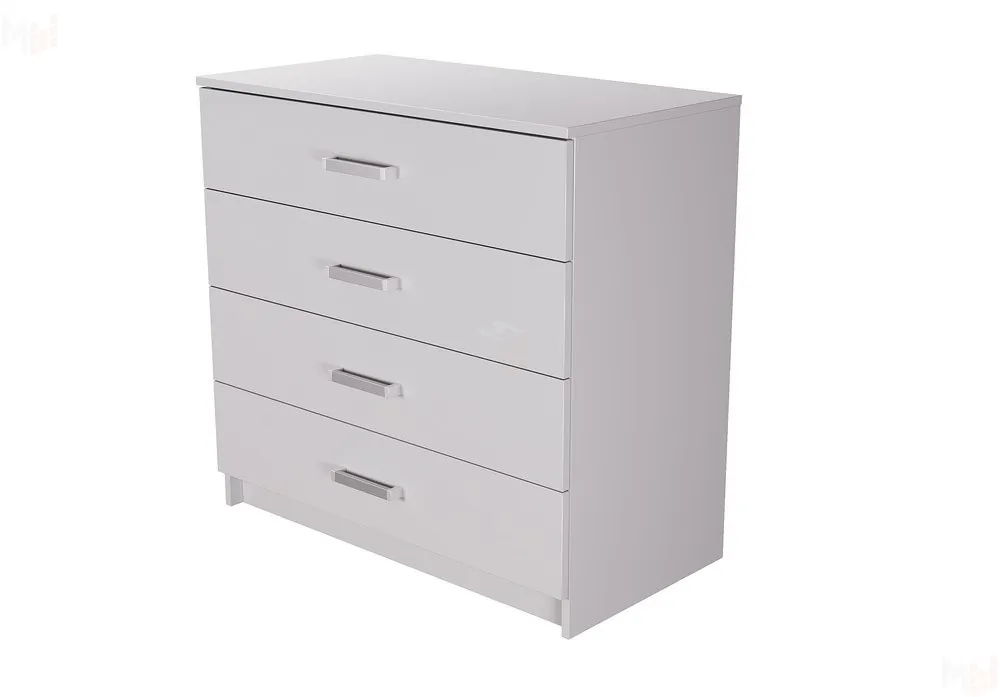 Комод имеет цокольную систему. В качестве опор используются подпятники черного цвета. Фасад ящика с обратной стороны имеет пропил под дно ящика. Направляющие роликовые (цвет белый).