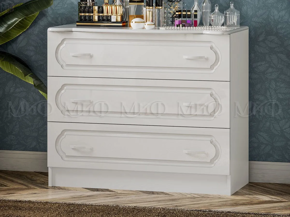 Комод белого цвета с 3 выдвижными ящиками. Фасады МДФ белый глянец, ручки пластик.