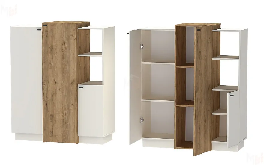 Разноуровневый комод оснащен тремя дверками с петлями с доводчиками.