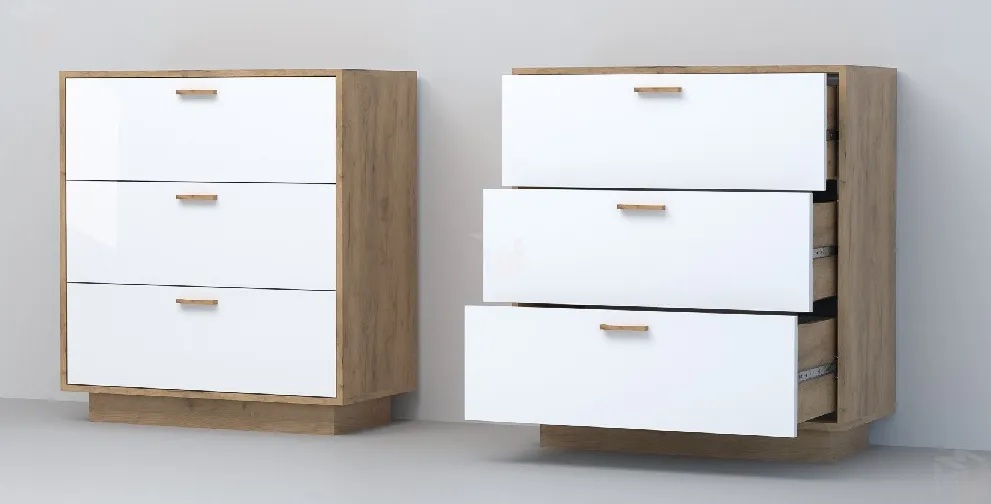 Современный комод оснащен тремя просторными выдвижными ящиками на шариковых направляющих полного выдвижения.
