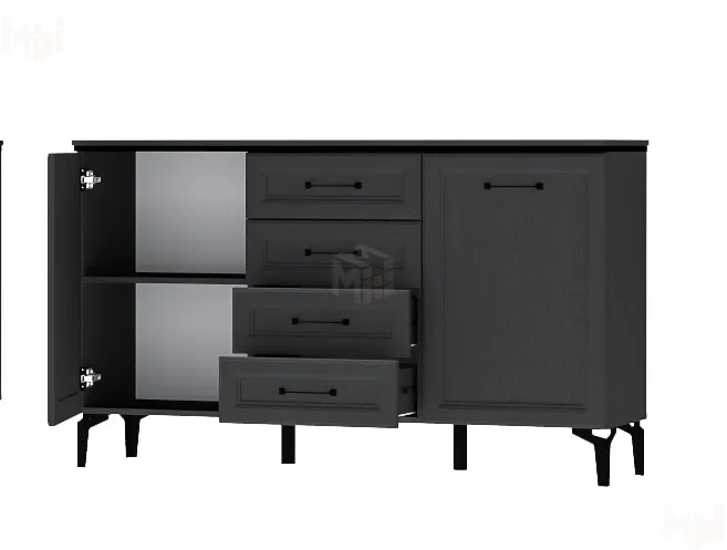 Комод с четырьмя выдвижными ящиками и двумя закрытыми нишами с полками внутри - удобная и полноценная система хранения, идеально подходящая для любого помещения: спальни, гостиной, рабочего кабинета, прихожей. В нём можно хранить текстиль, постельные принадлежности, нижнее бельё, косметику, документы, а столешницу использовать как функциональную полку для приятных мелочей: статуэток, красивых ваз, светильника, семейных фотографий. Цвет - антрацит. Фасады МДФ.