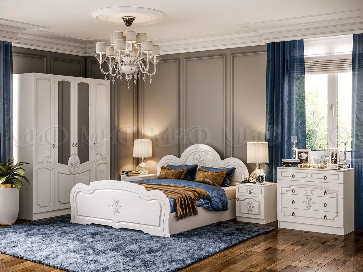 Комод является частью модульной спальни Каролина. Корпус комода выполнен из ЛДСП белого цвета, фасады МДФ белый глянец.