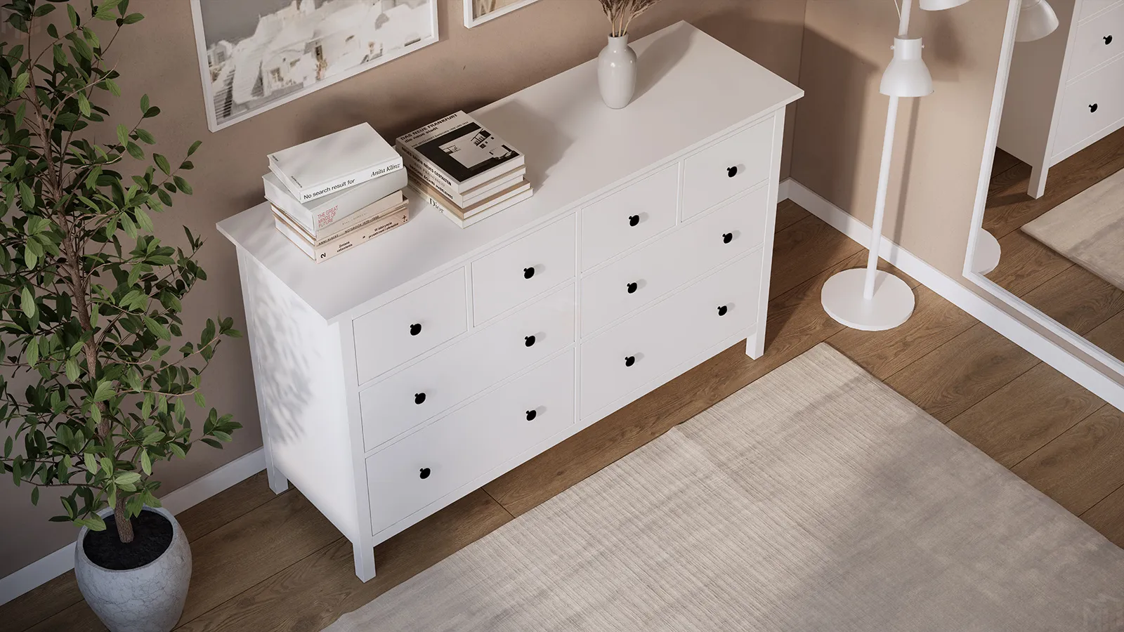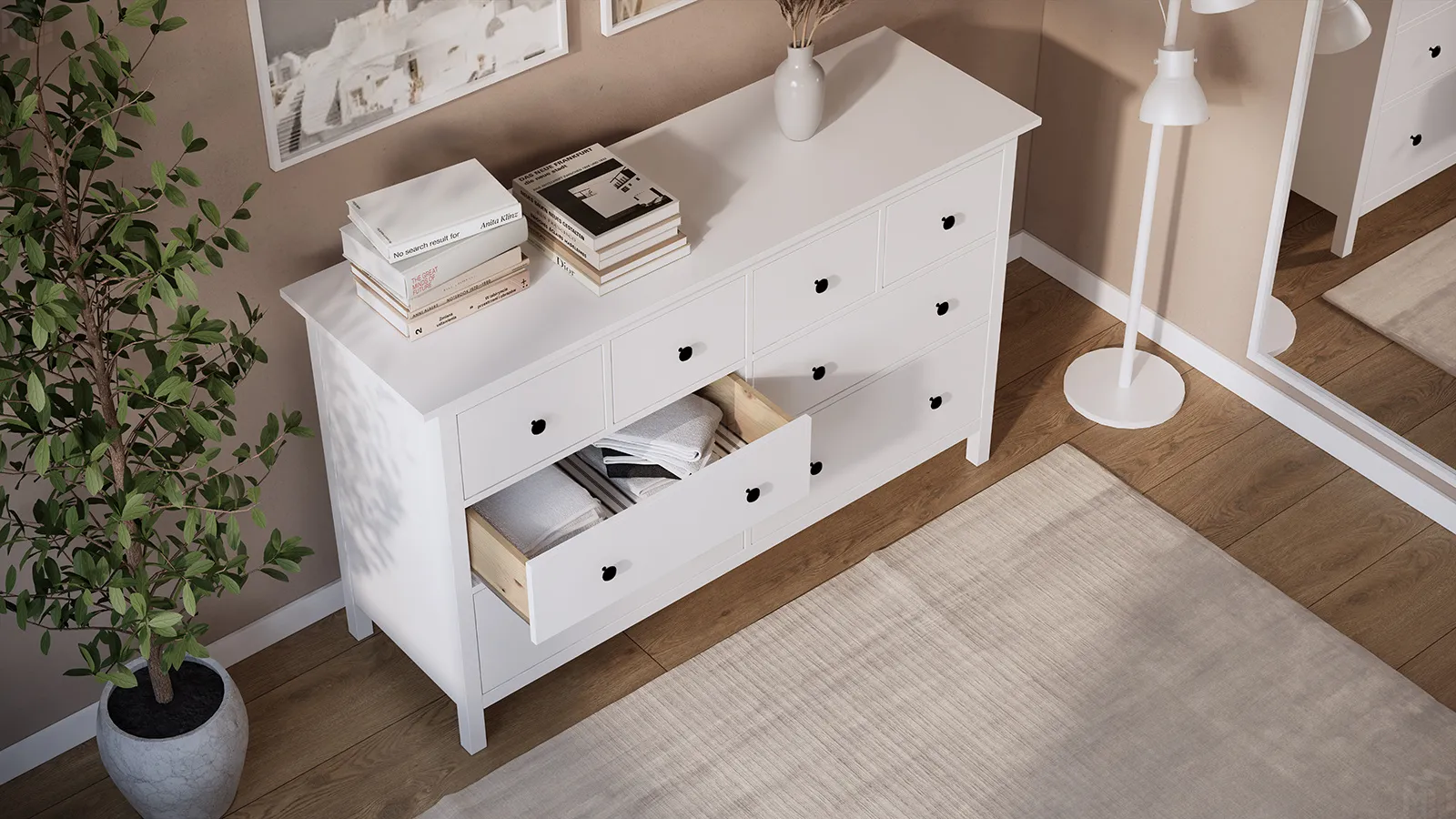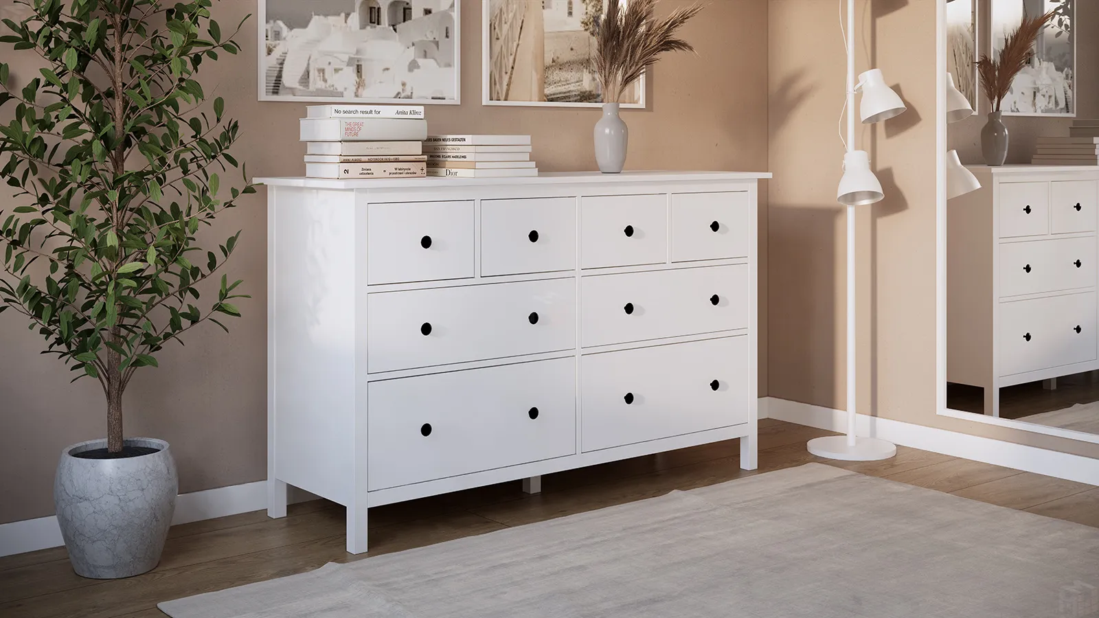 Шиpокий комод обеспечит достаточно места для хранения, а на его верхнюю панель можно поставить лампу и другие предметы, которые вы хотите продемонстрировать.