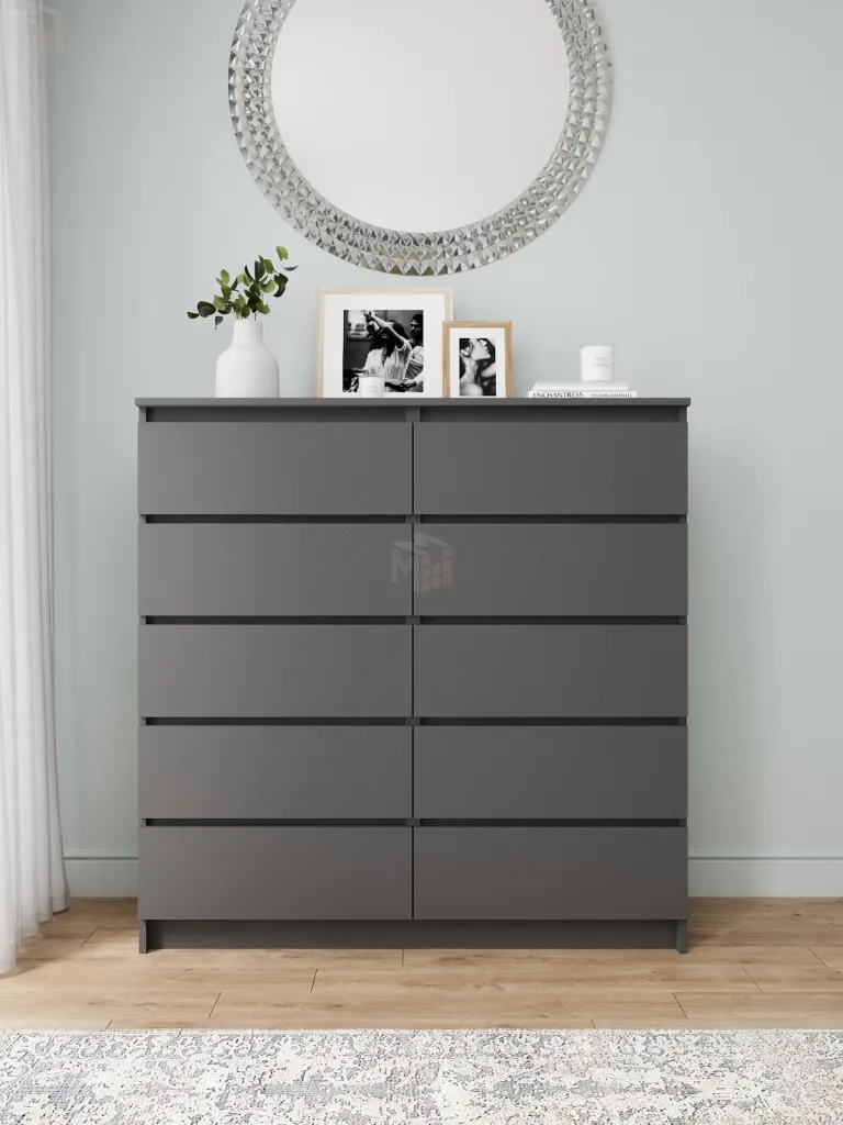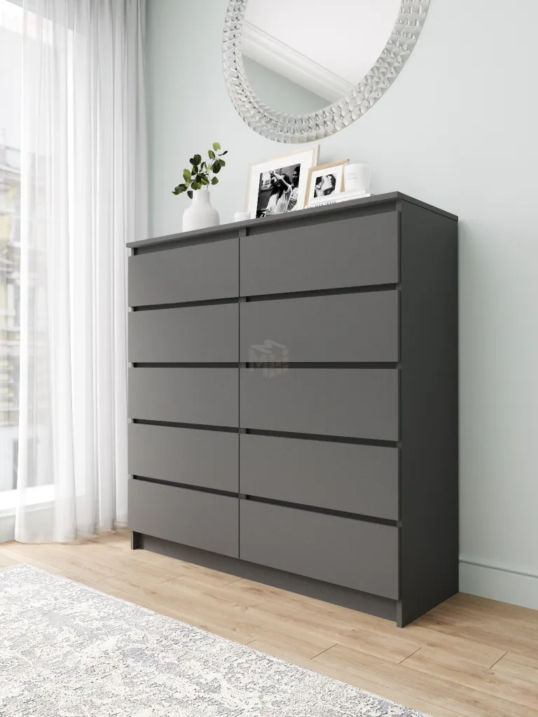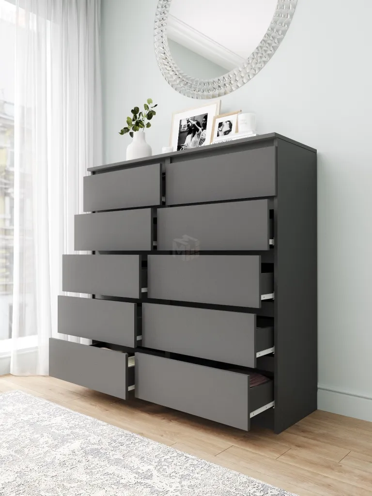 Комод разделен на две секции перегородкой, в каждой секции три выдвижных ящика на роликовых направляющих.