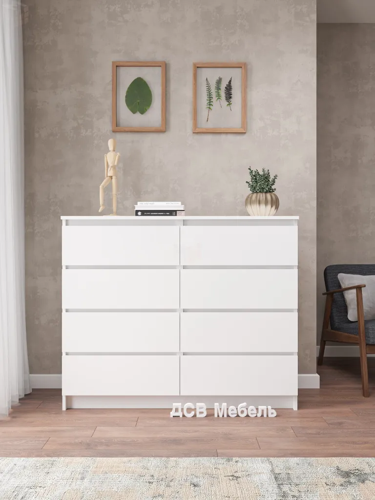 Комод разделен на две секции перегородкой, в каждой секции четыре выдвижных ящика на роликовых направляющих.