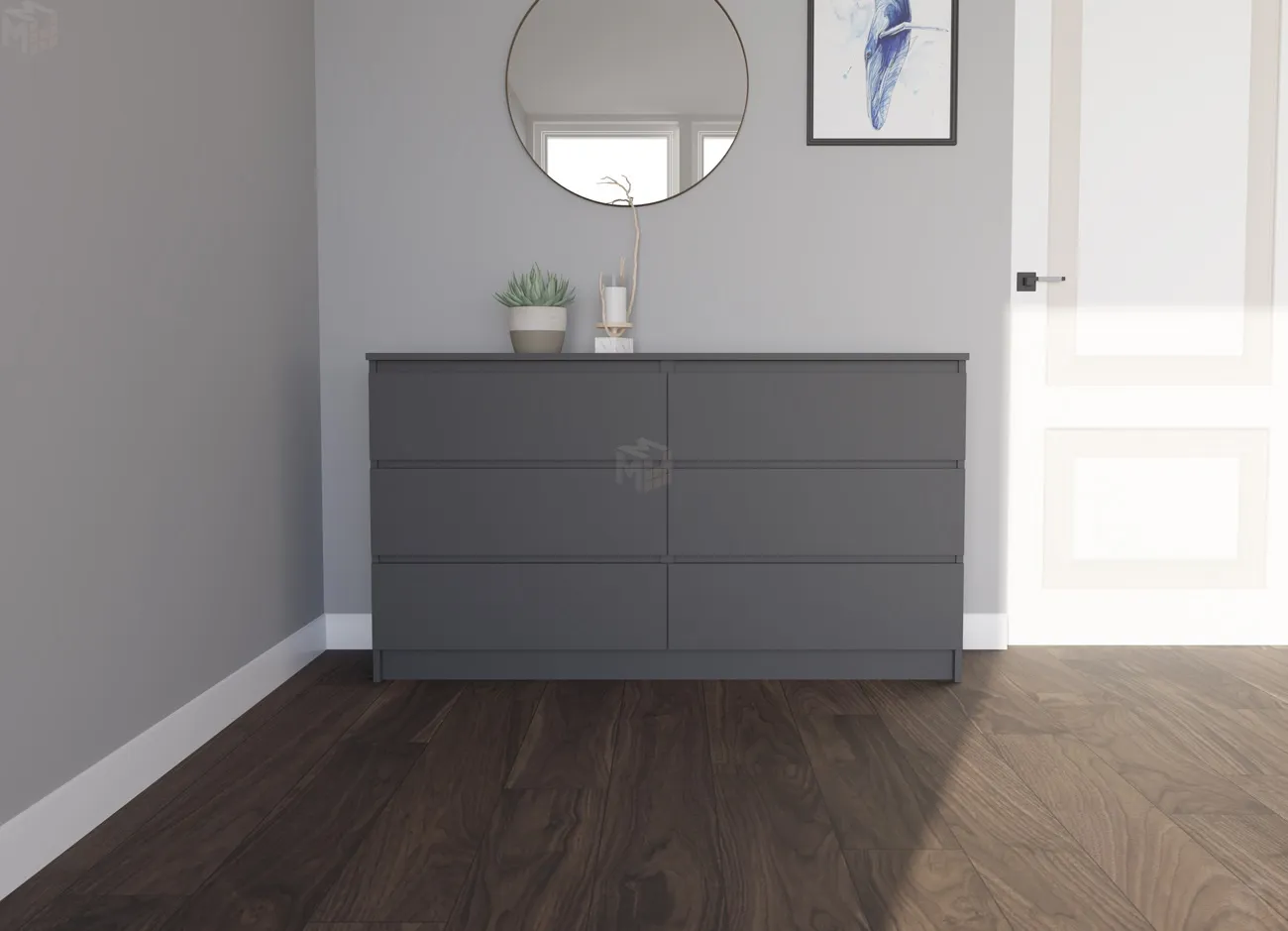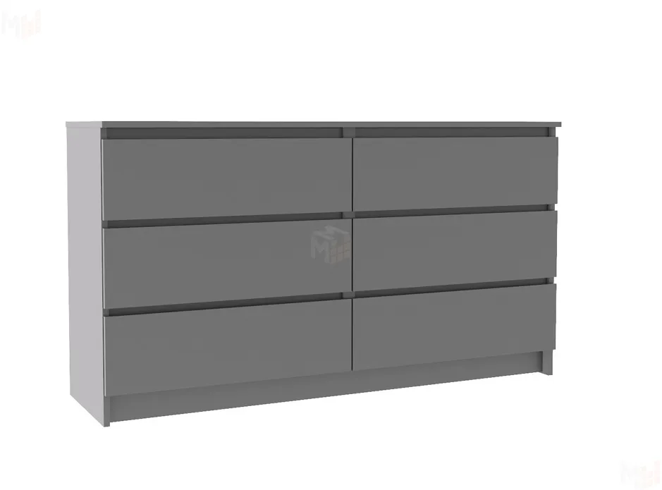 Комод разделен на две секции перегородкой, в каждой секции три выдвижных ящика на роликовых направляющих.