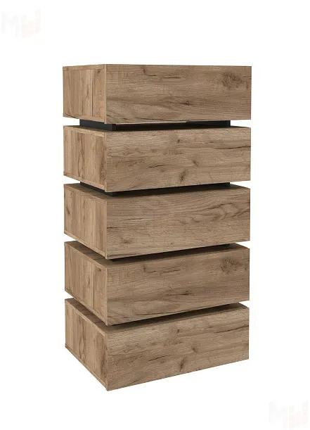 Для маленькой гостиной отлично подойдет высокий и узкий комод Nature 6. Гладкие фасады ящиков в теплом декоре дуб табачный Craft с контрастными черными боковыми планками снизу делают его по-настоящему особенным. Пять выдвижных ящиков глубиной 14 см способны вместить все необходимое, а компактная конструкция сэкономит место в комнате. Ящики легко открываются за свес благодаря направляющим полного выдвижения. Они быстро и легко устанавливаются при сборке комода. Регулируемые опоры компенсируют незначительные неровности пола.