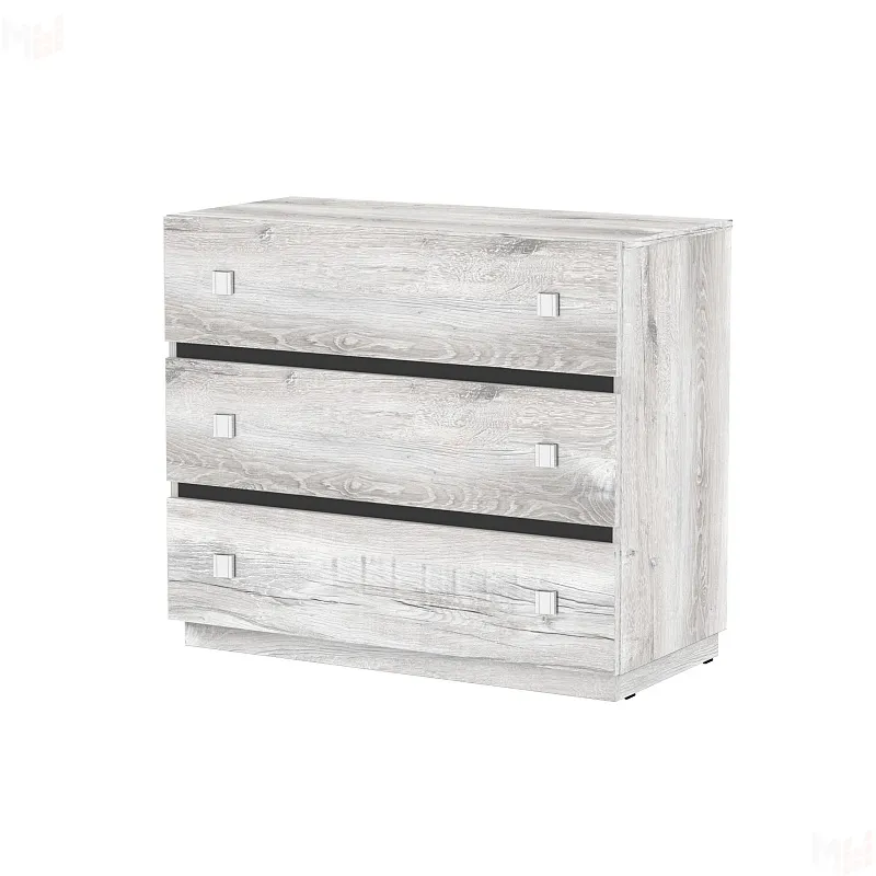 Широкий и вместительный комод выступит хорошим дополнением интерьера спальни, способным подчеркнуть изысканный вкус хозяев. Спокойный натуральный оттенок и красивая древесная текстура выгодно сочетается с темными вставками из ЛДСП. Несмотря на небольшие размеры, комод прекрасно сэкономит свободное пространство помещения. Три выдвижных ящика глубиной 35 см, высотой 14 см и шириной 83 см позволят рассортировать и удобно хранить одежду и аксессуары. Ящики комода оснащены шариковыми направляющими полного выдвижения, благодаря которым легко получить доступ к содержимому отсеков. Надежные металлические ручки не изменят свой внешний вид со временем. А оптимальная ширина столешницы комода позволит легко разместить телевизор диагональю до 40".