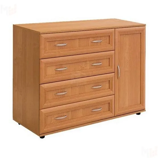 Модель №117 отличается от общепринятого исполнения тем, что у неё кроме ящиков есть дверь. В отделении, закрывающемся дверкой, расположены полки, которые удобно использовать для хранения различных вещей. В просторные ящики комода помещается большое количество белья, и при этом он занимает немного места (ш120 см, г45 см, в 87 см).
