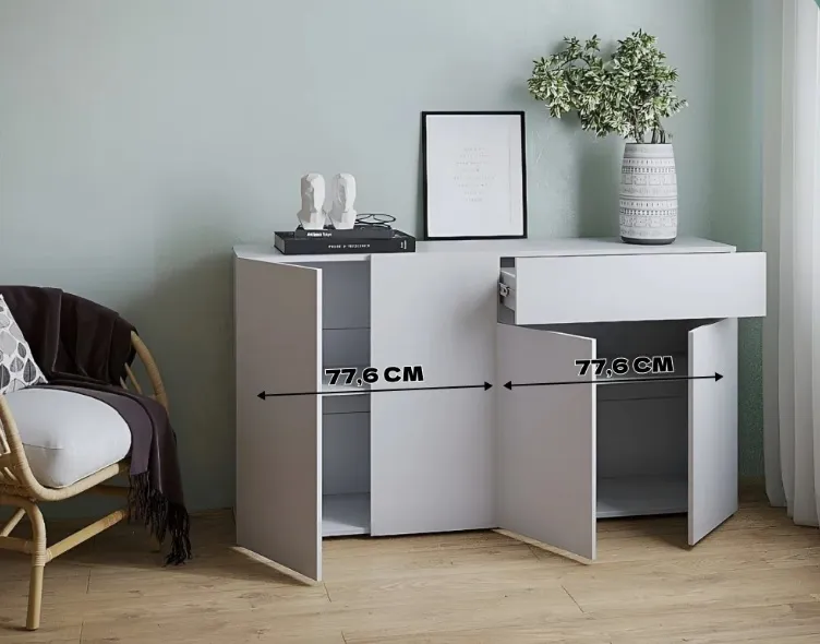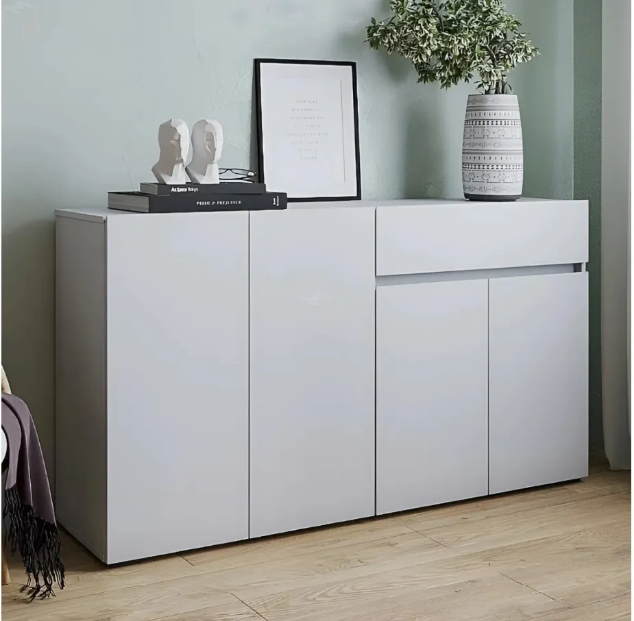 Один выдвижной ящик на шариковых направляющих (полного выдвижения),четыре распашные створки,соединение элементов мебельной конструкции с помощью эксцентриков.
