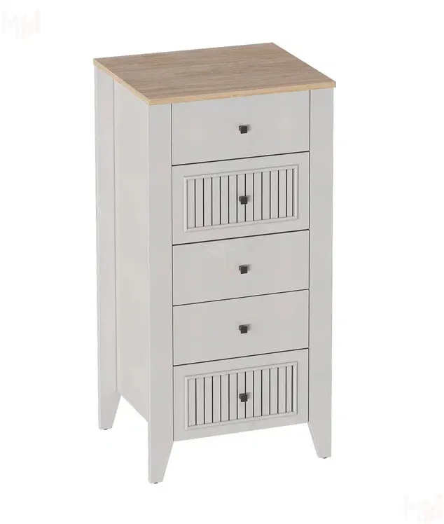 Комод с 5 ящиками Валенсия выполнен из (ЛДСП) в комбинации Дуб натуральный светлый / Персидский жемчуг.