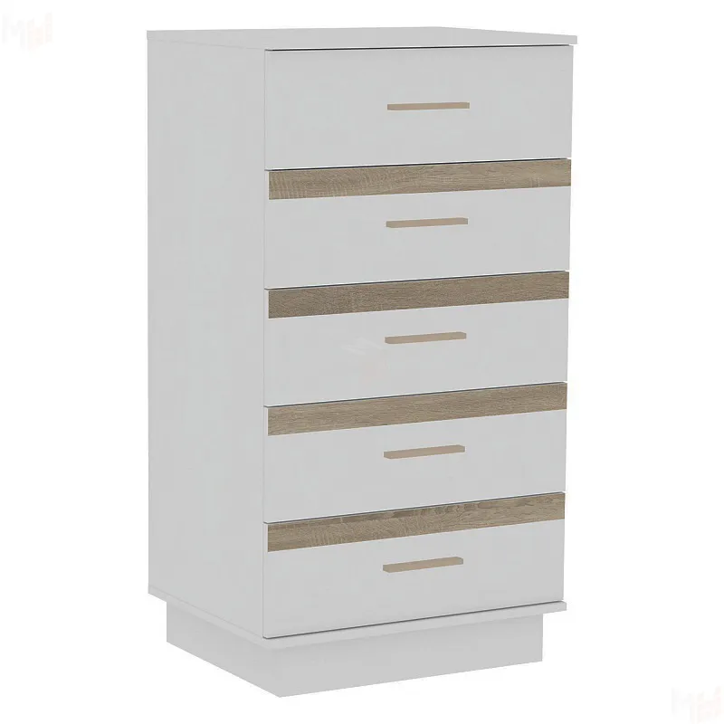АНОНА 3 Комод высокий с 5 ящиками - очень вместительный, практичный и стильный предмет домашнего интерьера, который соответствует всем правилам эргономики. Тёмный узкий комод с древесными вставками займет совсем не много места в спальне.