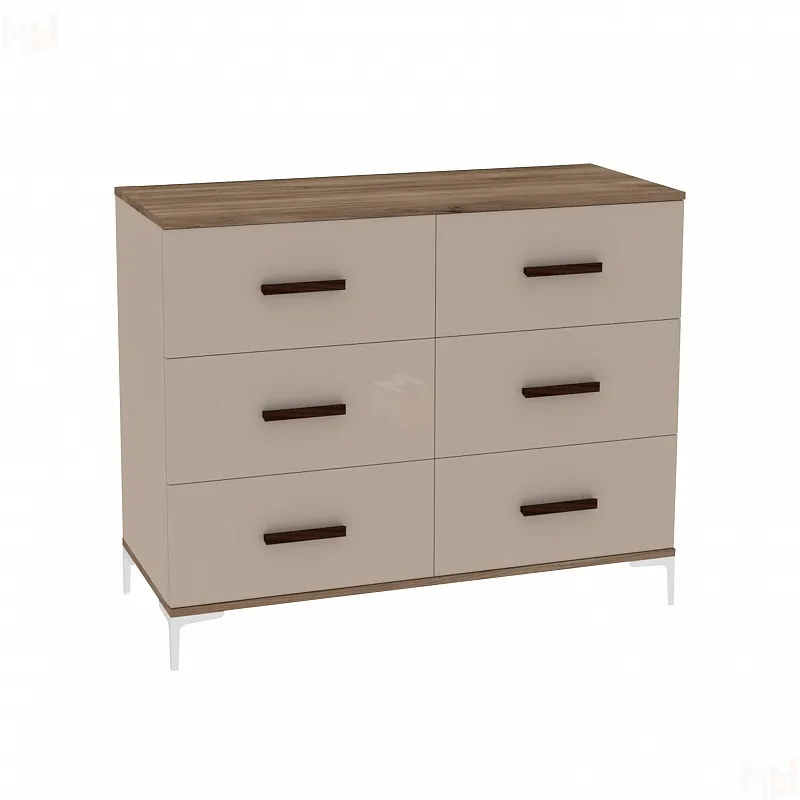 Широкий вместительный комод с шестью ящиками – функциональный модуль, который подходит не только для хранения вещей, но и для размещения телевизора. Столешница и основание комода подчеркнуты контрастным декором Дуб Табачный. Фигурные металлические опоры и ручки из массива органично дополняют модуль.