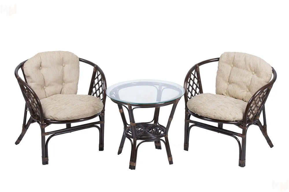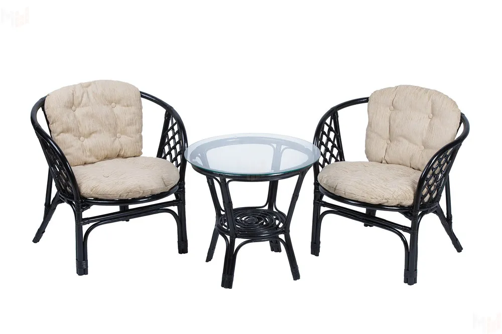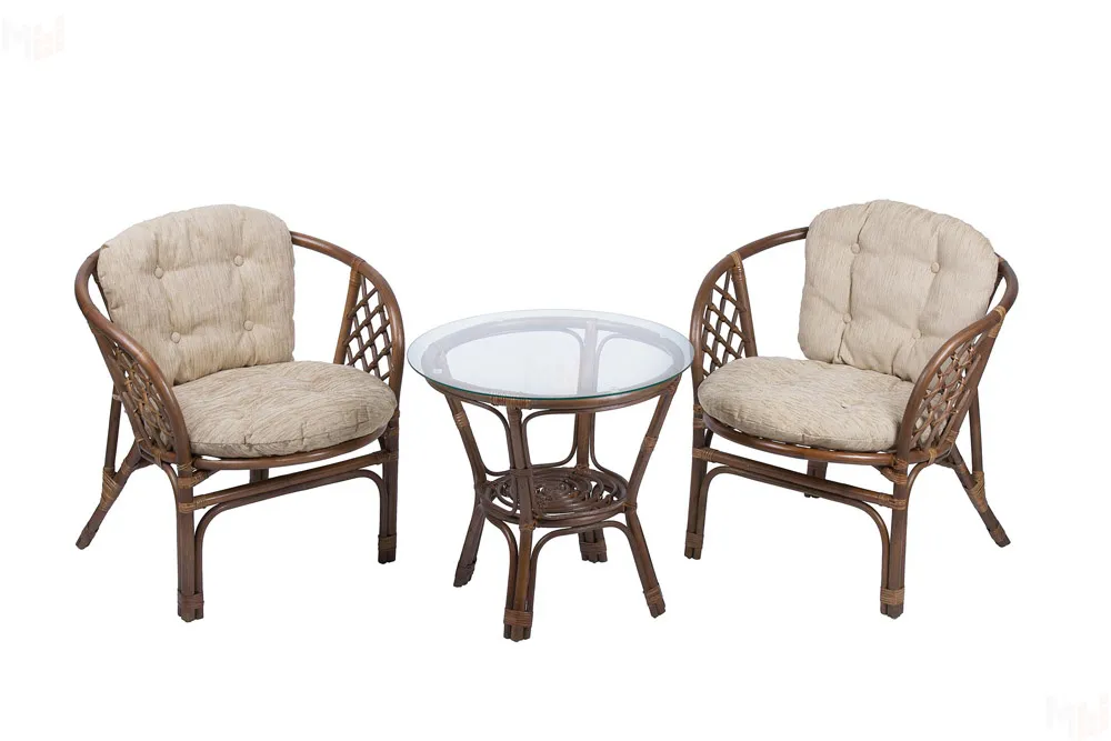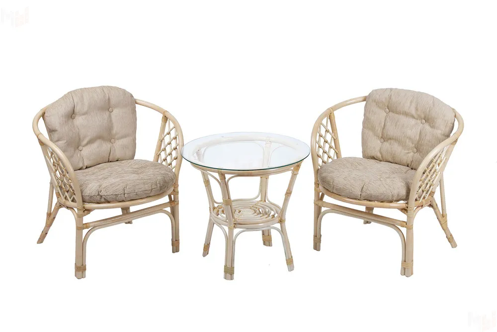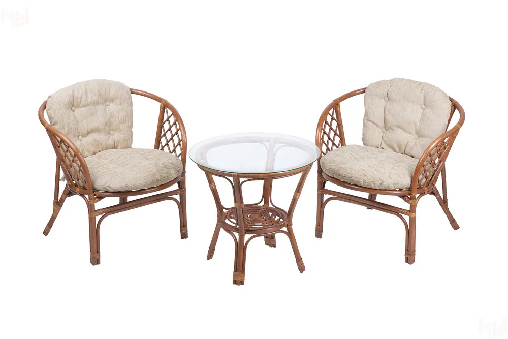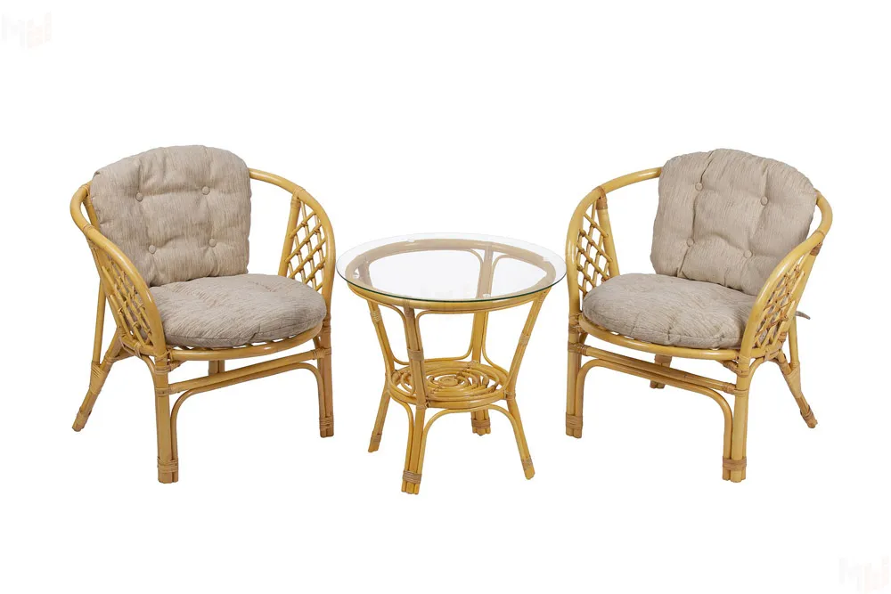 Комплект из натурального ротанга, состоящий из двух кресел и круглого столика с плетеной столешницей. Стекло входит в комплект.