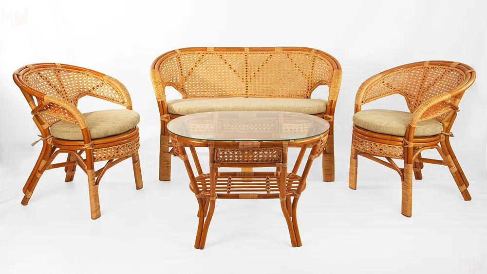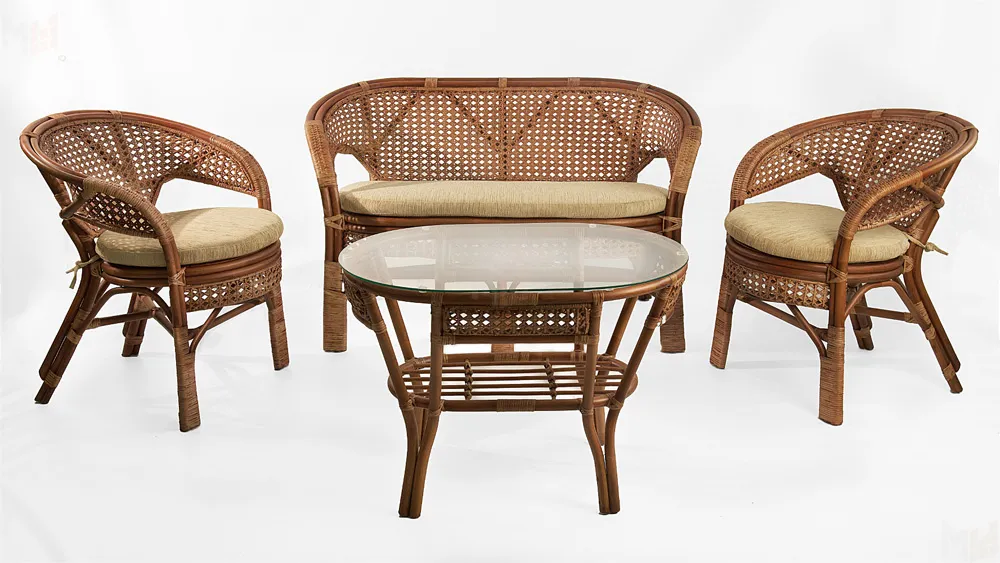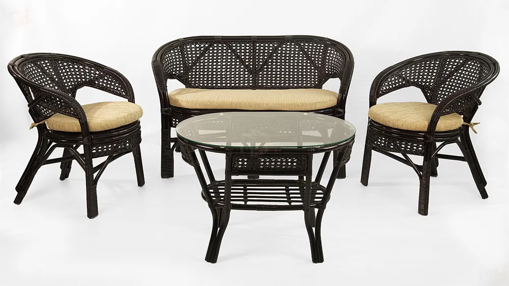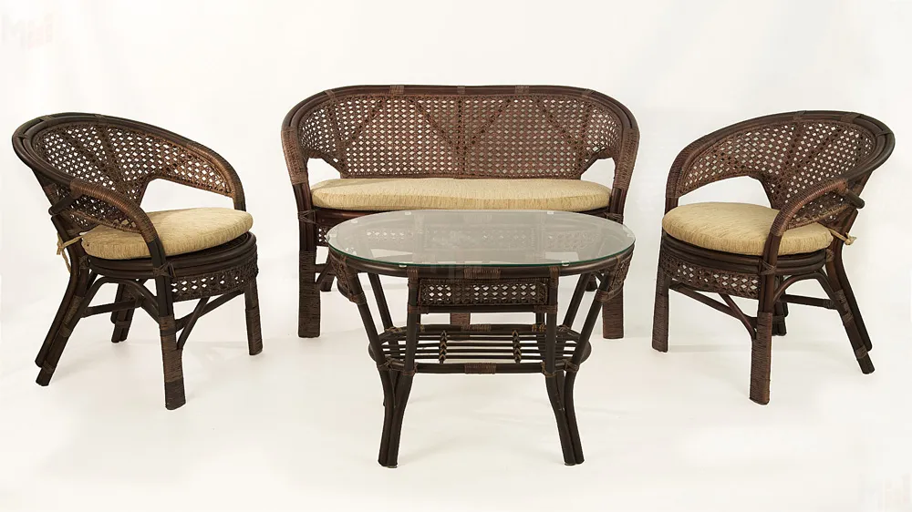 Комплект мебели для террасы 02/15 включает в себя: 2 кресла, плетеный двухместный диван и овальный столик журнальный, подушки из качественного материала.