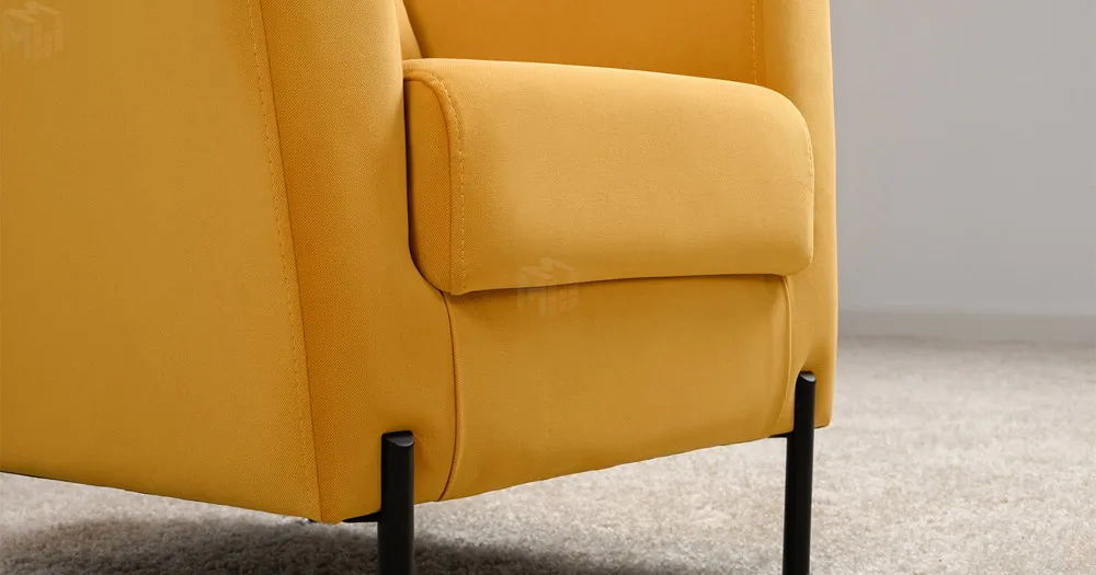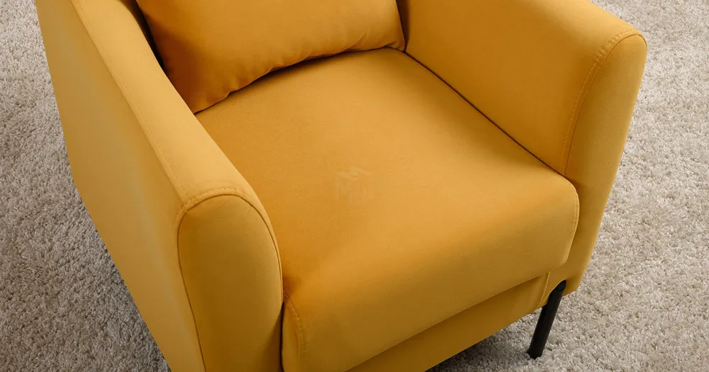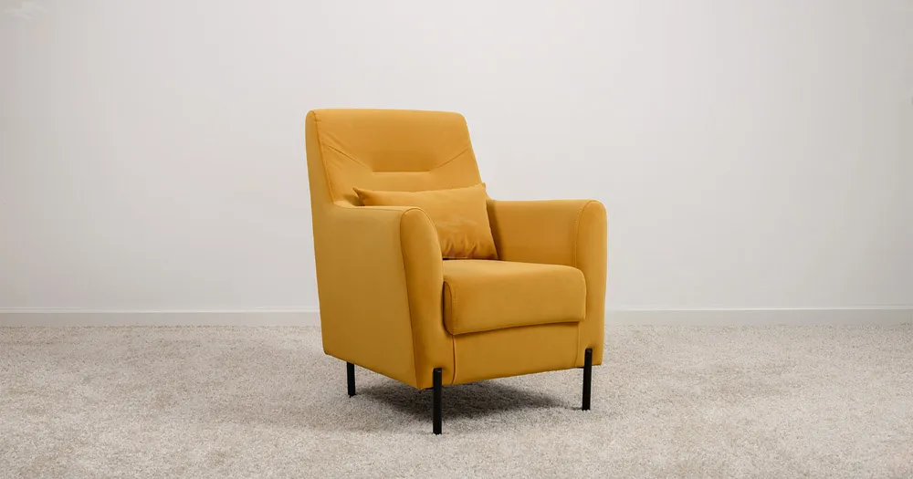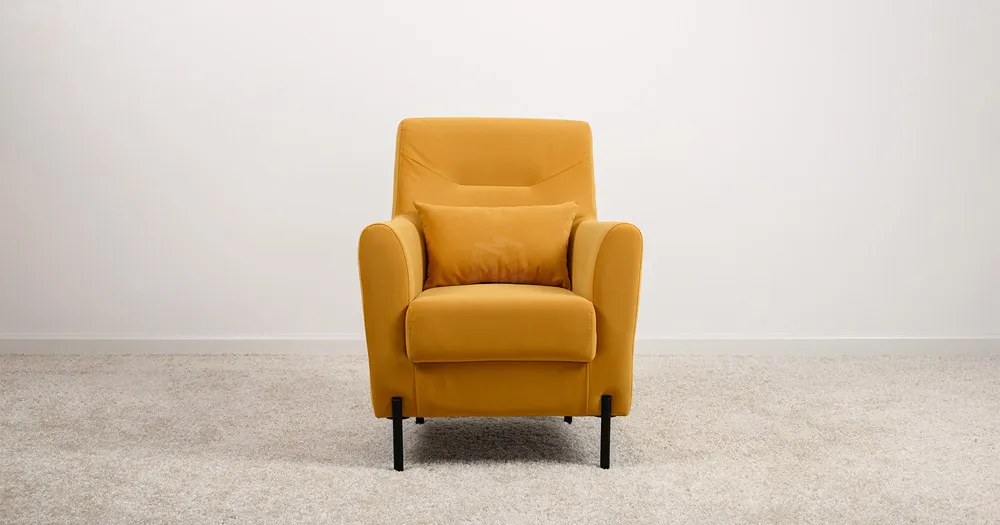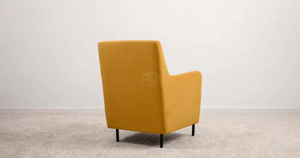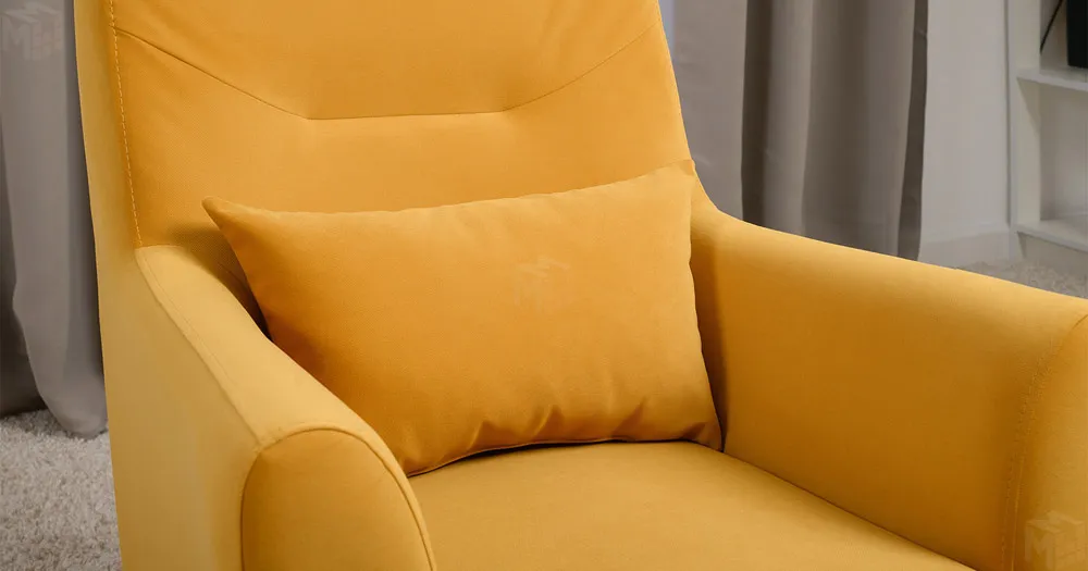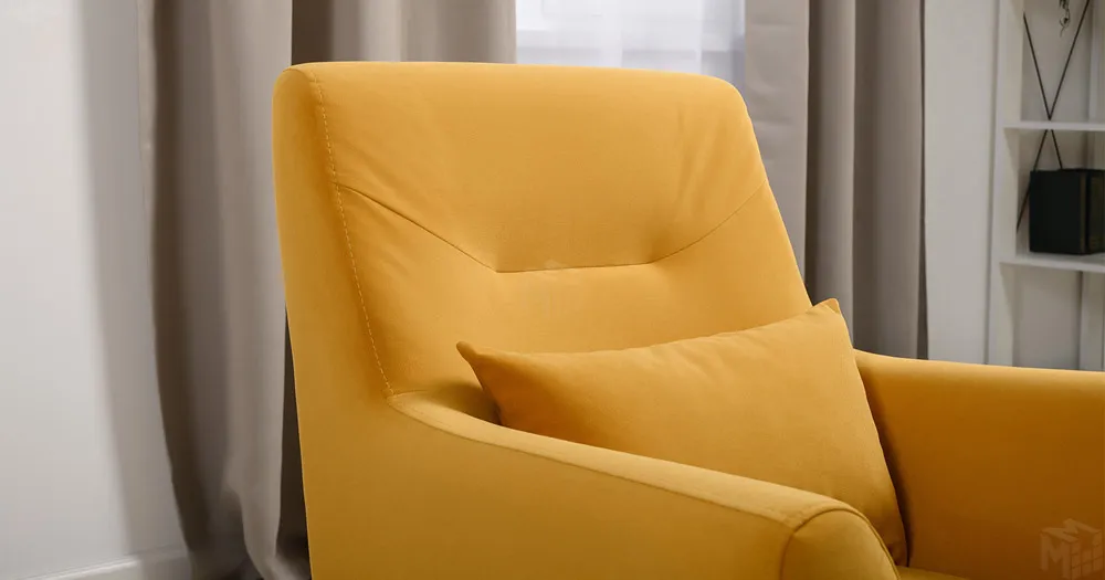 Декоративная утяжка на спинке кресла, декоративная подушка в цвете кресла, металлические опоры переходят в декоративный элемент подлокотника
