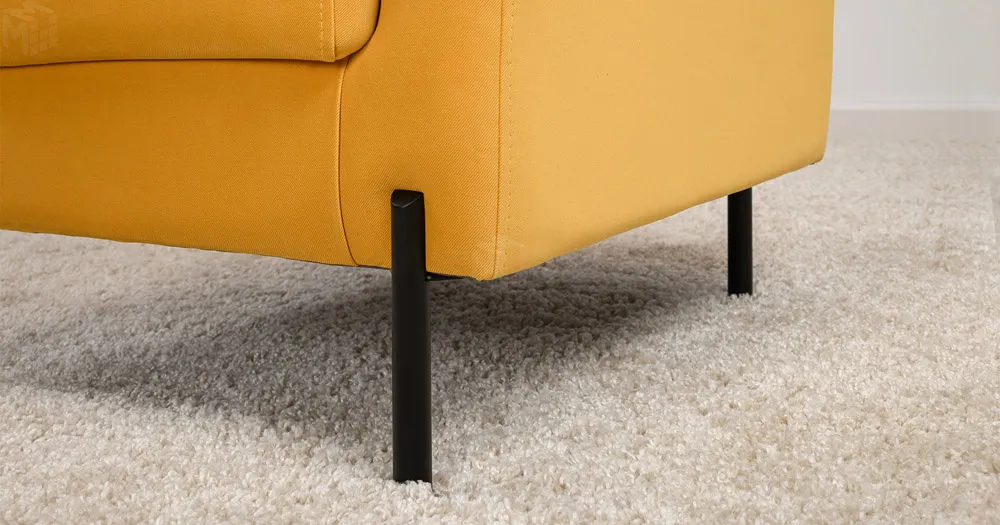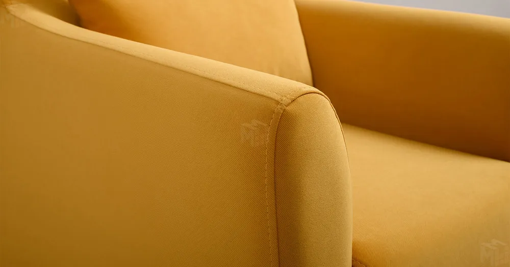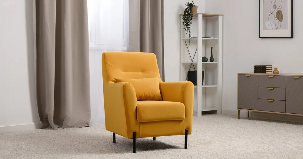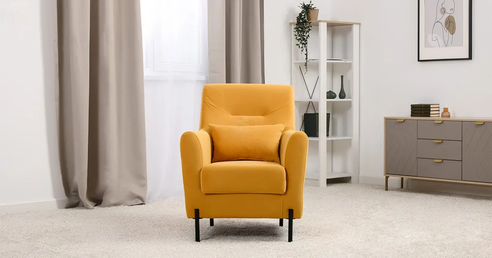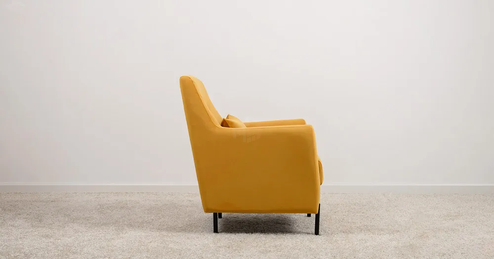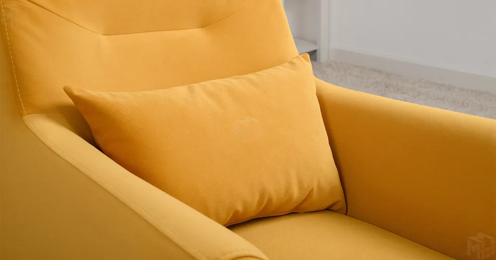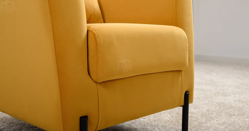 Декоративная утяжка на спинке кресла, декоративная подушка в цвете кресла, металлические опоры переходят в декоративный элемент подлокотника