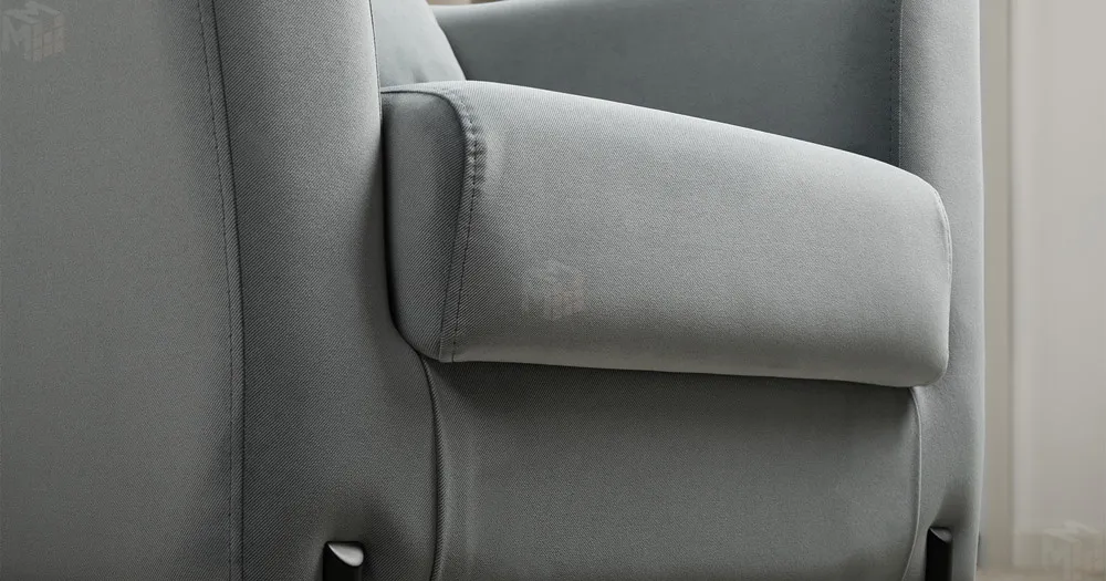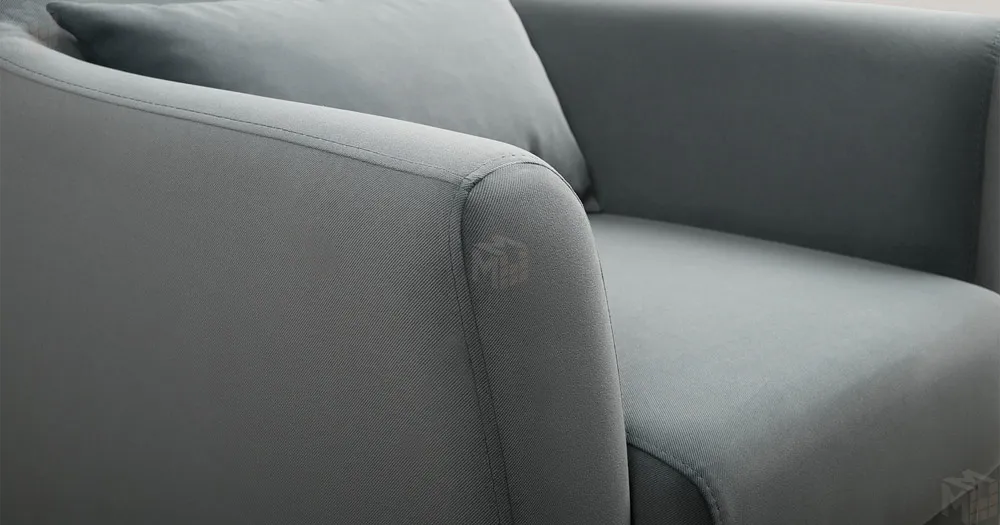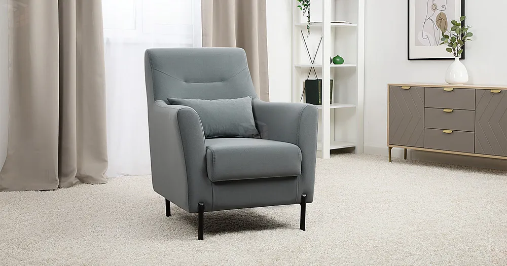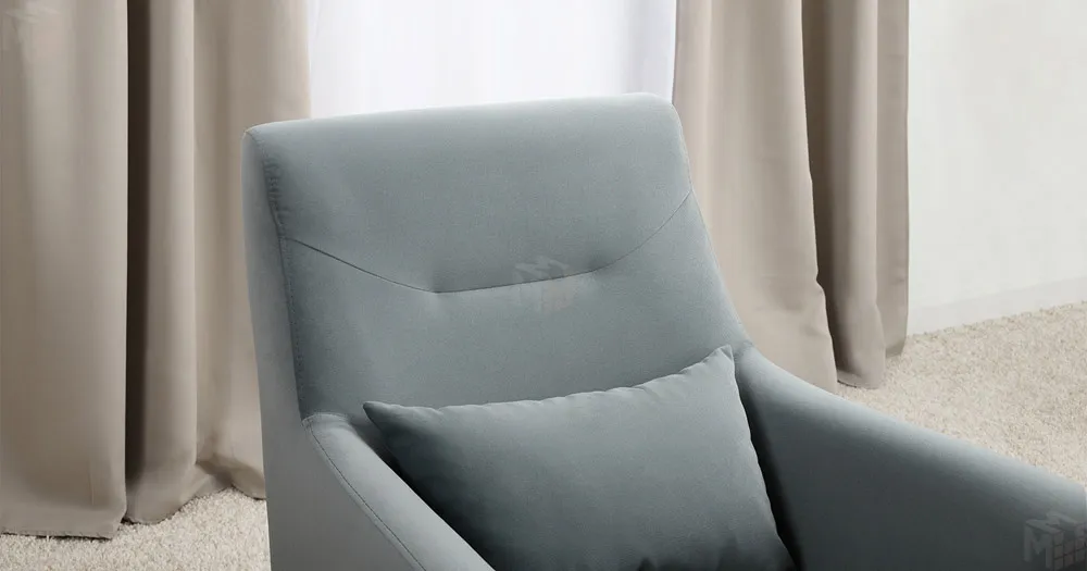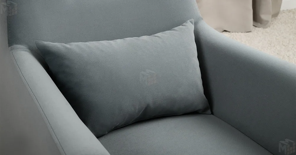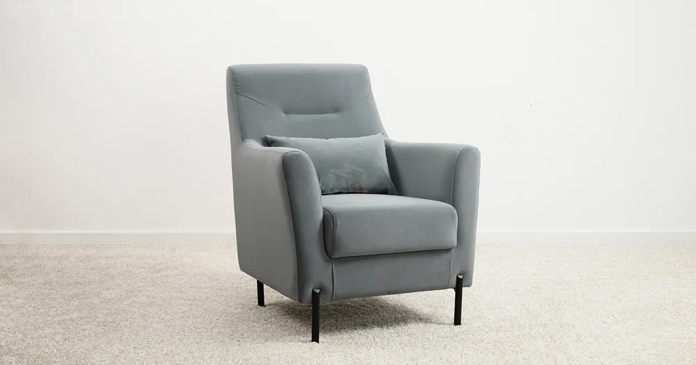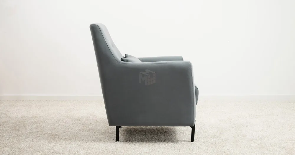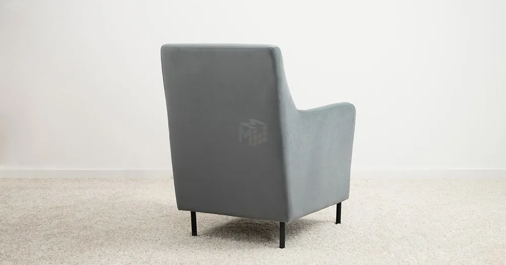 Декоративная утяжка на спинке кресла, декоративная подушка в цвете кресла, металлические опоры переходят в декоративный элемент подлокотника