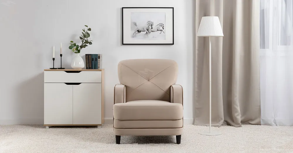 Декоративные канты на вставке подлокотников. Пуговицы в местах пересечения кантов на подушке и вставке подлокотников. По торцам подлокотников и думках контрастный декоративный кант. Защипы на сиденье и подушке.