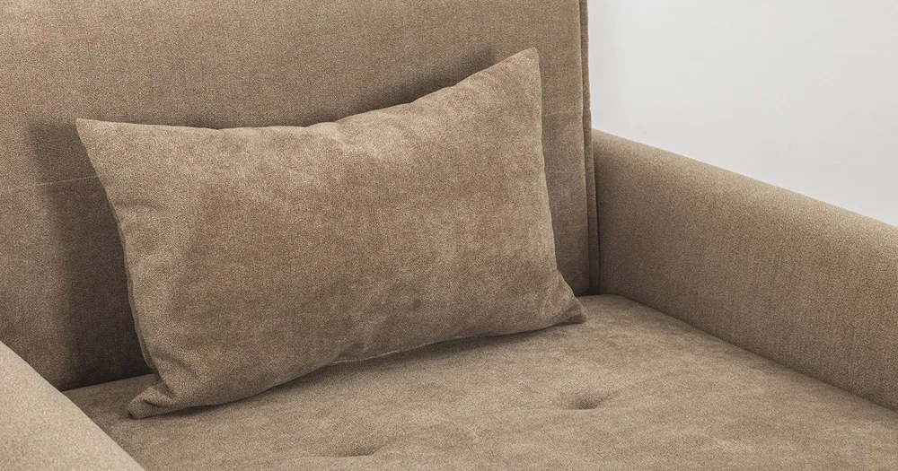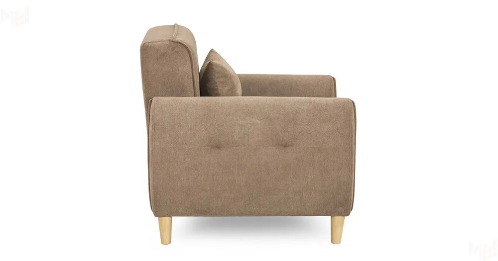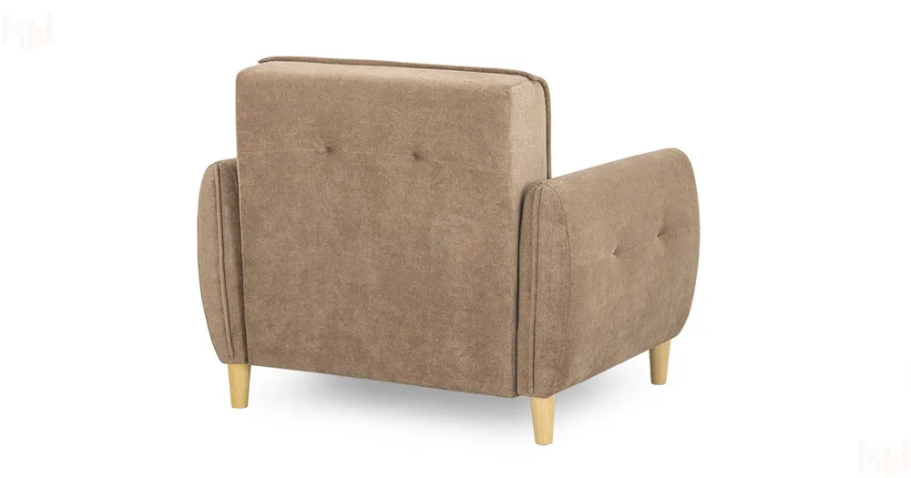 Мягкая спинка с имитацией приспинных подушек. Утяжки на передней и задней стороне спинки, на сиденье и подлокотниках.