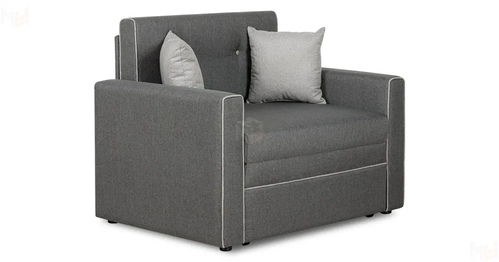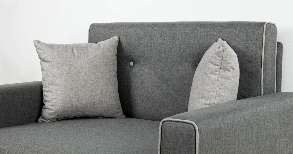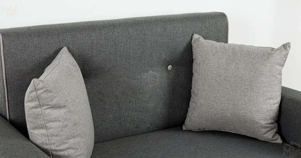Декоративный контрастный кант по торцу спинки, торцу подлокотника, по верхнему срезу царги. Утяжки с пуговицами на спинке дивана. Две декоративные подушки в контрастной ткани.