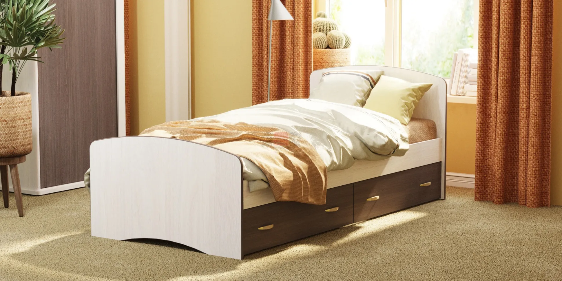 Кровать выполнена из ЛДСП, в комплект входят 2 выдвижных ящика на выкатных роликах. Размер спального места 80*200 см. Матрас приобретается дополнительно.