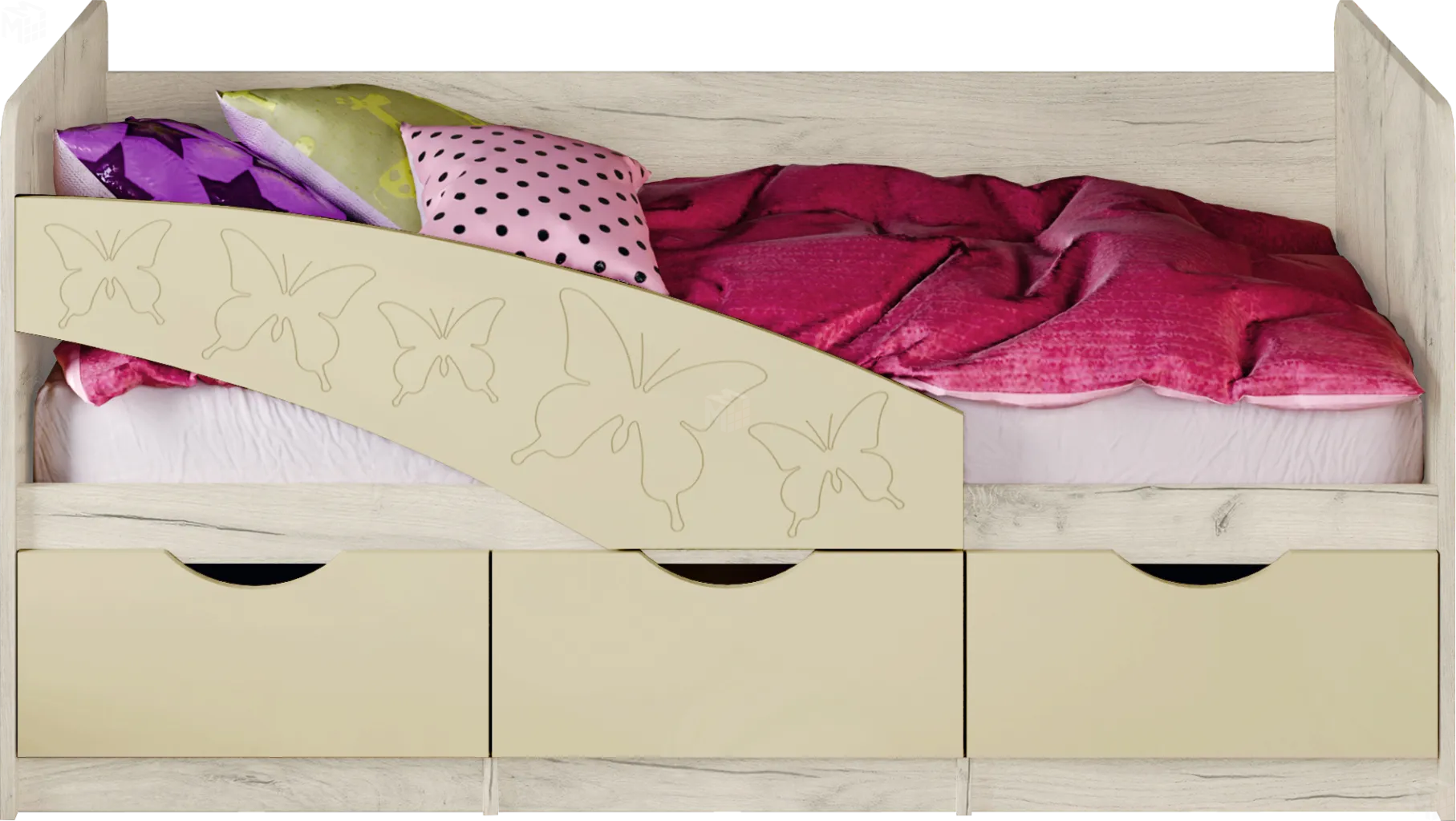 Детская кровать Бабочки - отличное решение для детской комнаты. Фасад кровати оформлен панелью с рельефным изображением бабочек. Кроме декоративной, он несет также защитную функцию – предотвращает возможность падения ребенка на пол во время сна.