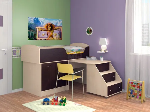 Кровать-чердак Дюймовочка-2 представляет собой самодостаточный комплекс включающий в себя зону для сна, тумбу, лестницу -комод и полноценный рабочий стол. Прочная конструкция рассчитана на детей от 1,5 до 10 лет. Такая детская обеспечит разумную экономию пространства в вашем доме и полностью обеспечит выполнение всех многообразных функций детской комнаты.
