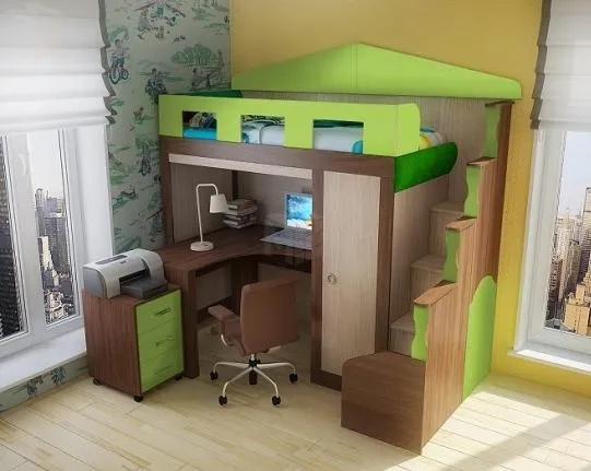 Кровать-чердак с нишей Фанки Хоум с тумбой и письменным столом Фанки Тайм.